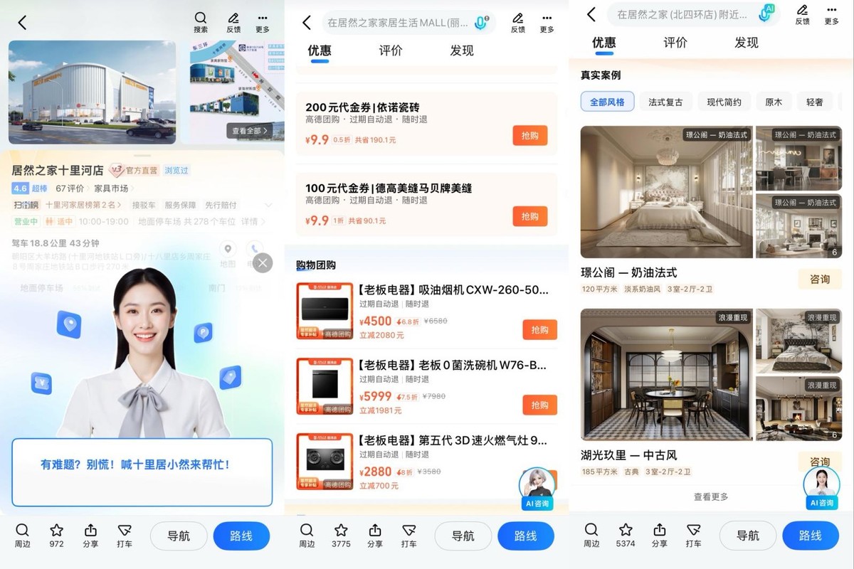 目前,已有40余家居然之家卖场入驻高德,用户在高德地图搜索“居然之家”或相关家装关键词时,可在门店详情页直接查看商品价格、楼层导览,并支持在线互动咨询与一键导航至门店,真正实现“搜—导—询—购”一体化体验。