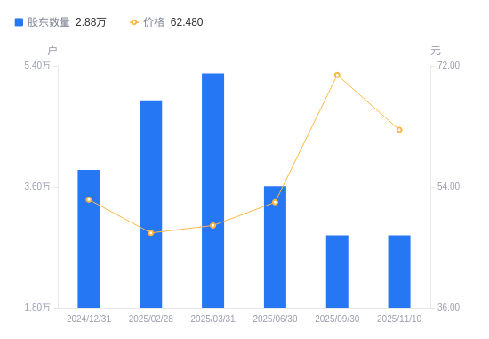 日期A股户数(户)流通A股户均持股数(股)户均持股市值(万元)2025-11-102879323884.81149.232025-09-302879323884.81168.722025-06-303609019055.5798.542025-03-315286513008.9062.772025-02-284888214068.8966.332024-12-313852217852.5493.012024-09-304038617028.5693.182024-06-304393115654.4475.702024-03-315322212921.6456.052024-02-295888511678.9644.24