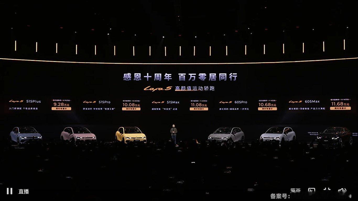 11月27日零跑Lafa5上市,限时9.28万起(官方指导价9.78-12.18万),共5款车型。车身4430/1880/1520mm、轴距2735mm,配132kW/160kW电机,零百加速6.4秒起。CLTC续航515km/605km,全系800V架构,18分钟快充30%-80%。搭高通8295芯片+双AI大模型,Max版配激光雷达,支持高阶智驾。零跑Lafa5开启轿跑10万级时代所以年轻人们,你们的第一辆车会是这种样子吗?