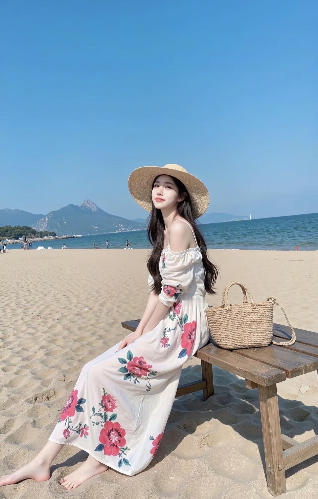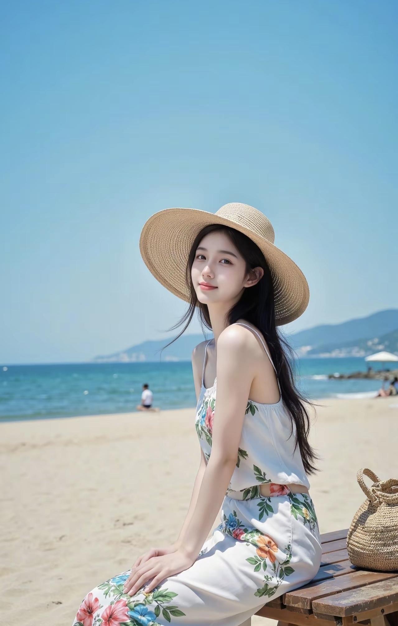 裙角沾了沙粒的暖,草帽扣住整片蓝天。海浪漫过远山的轮廓时,花影和夏风正一起落在肩头。