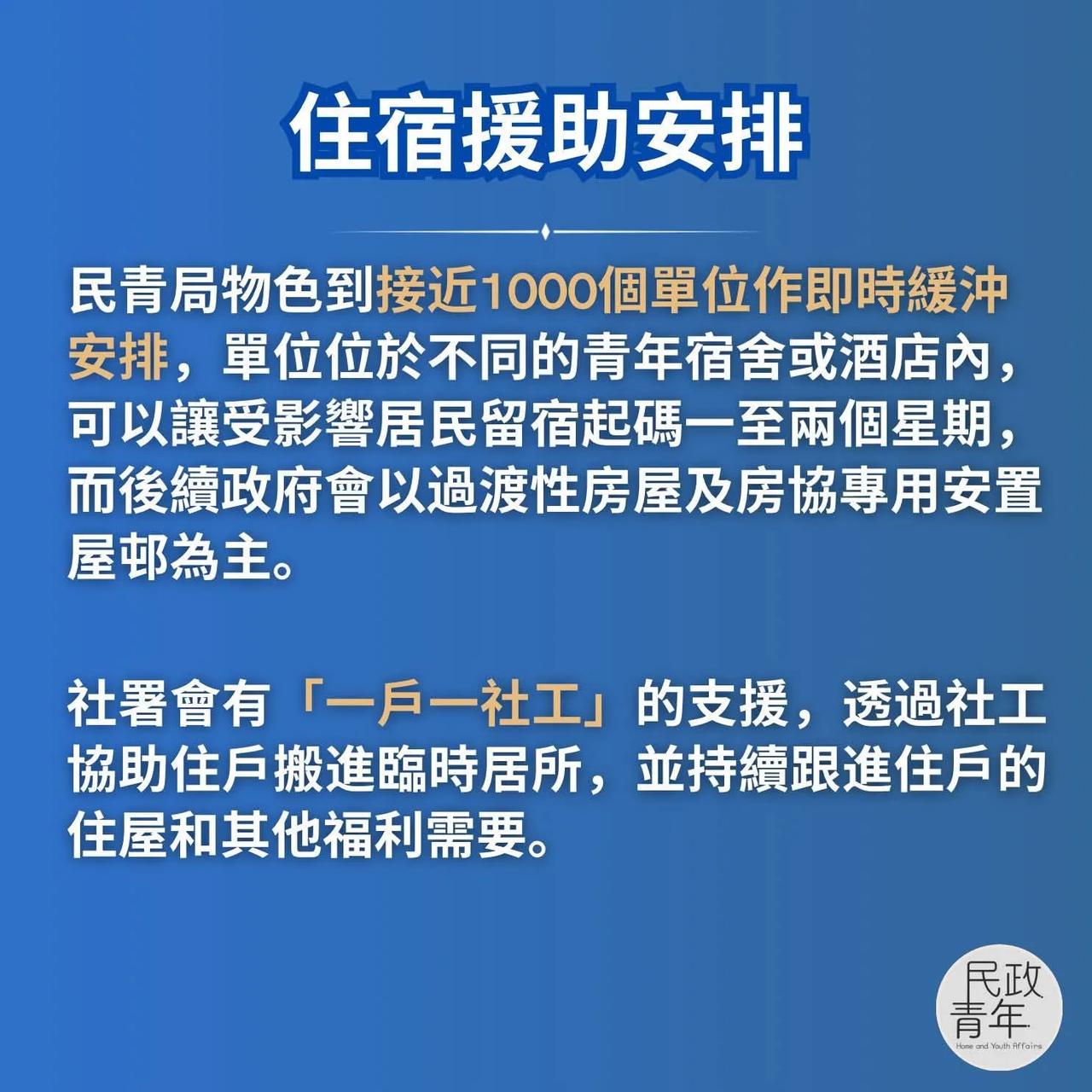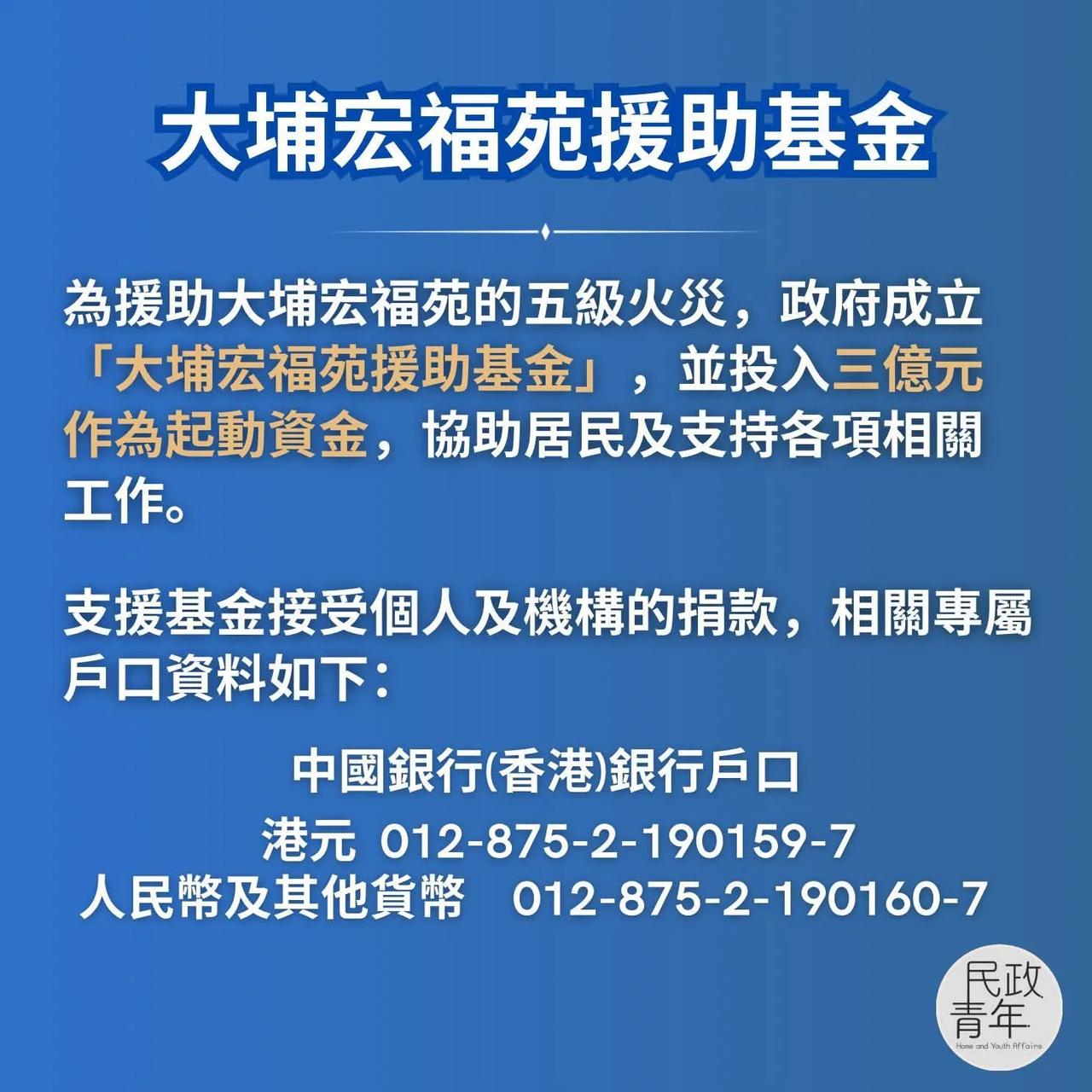 大埔宏福苑发生五级火灾,造成55人死亡,另有55人成功获救。行政长官今日下午表示,已召开跨部门会议,全面跟进火灾应对工作,并亲赴现场视察。目前,7座大厦的火势已大致受控,但救援工作仍在进行中。 政府援助措施 李家超宣布,政府将投入3亿元成立「大埔宏福苑援助基金」,并于今晚7时起接受港元捐款。 「大埔宏福苑援助基金 Support Fund for Wang Fuk Court in Tai Po」 中国银行(香港)银行户口 港元:012-875-2-190159-7 人民币及其他货币:012-875-2-190160-7 同时,政府将向每户受灾居民派发1万元应急援助金,以解燃眉之急。 灾民住宿安排 目前,有500名居民入住9个临时庇护中心。民政及青年事务局已物色近1000个青年宿舍及酒店单位,供受灾居民入住一至两週。后续将以政府过渡性房屋及房协专用安置居屋为主,初步可提供1800个单位。 心理及社会支援 政府将动员社工、临床心理学等专业人士,为受灾居民提供情绪支援。同时,实行「一住户一社工」制度,为每个受灾家庭提供个性化支援。 政府活动调整 李家超宣布,因应火灾事件,未来一段期间,所有政府主办的庆祝活动将取消或延期,官员将减少出席非必要活动。政府还将举办悼念活动,具体安排将稍后公布。