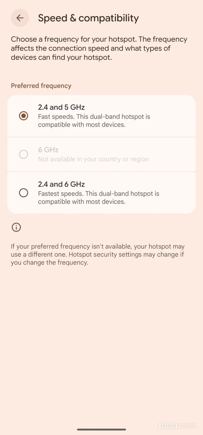 为此,谷歌在最新的AndroidCanary测试版系统中更新了热点设置项,加入了“2.4GHz/6GHz双频热点”选项,能够同时提供6GHz的高速和2.4GHz的广泛兼容性,让用户根据连接设备类型自由选择。