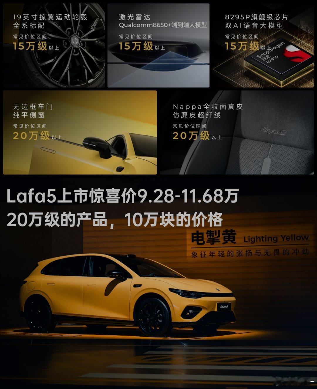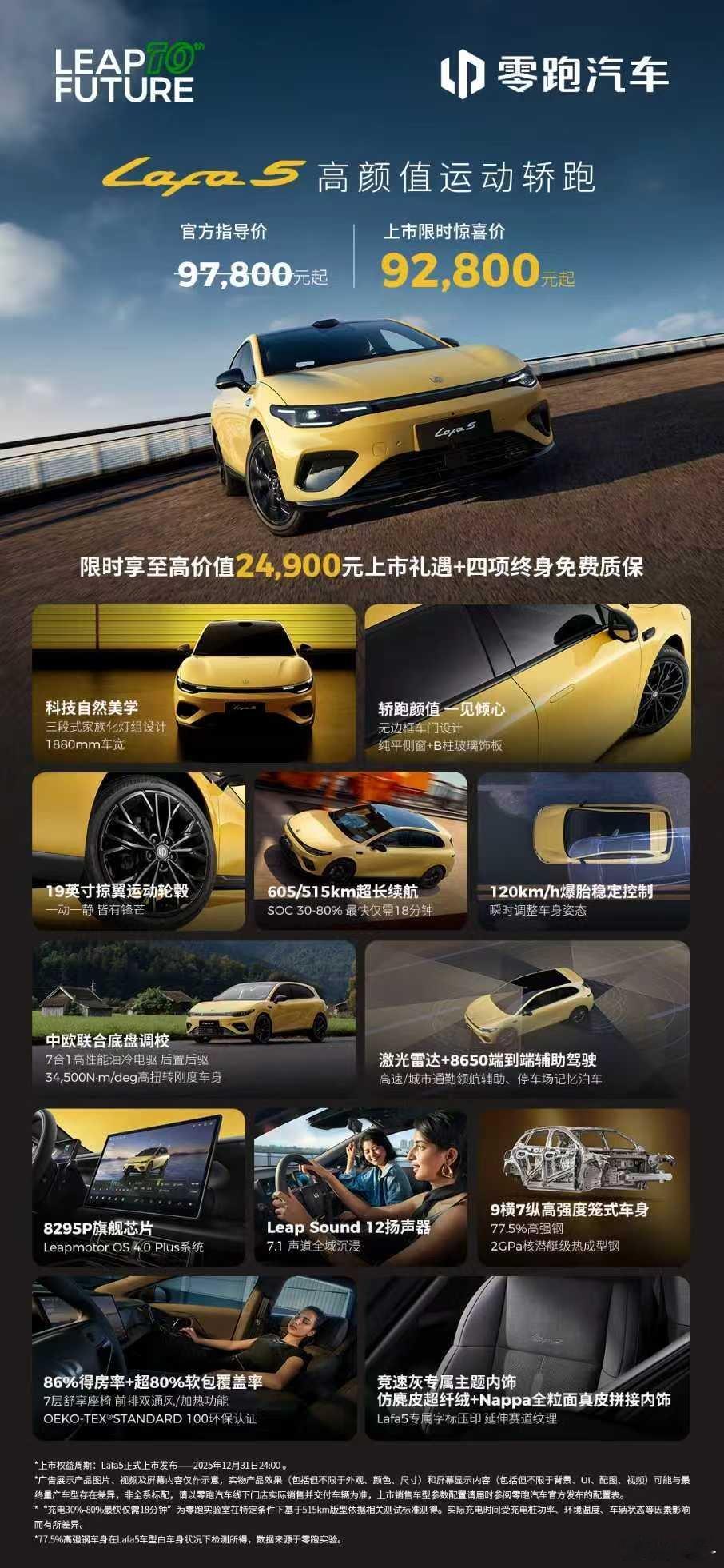 很多人对零跑的印象都是走量家用车,直到Lafa5的出现,一台高颜值运动轿跑,上市限时惊喜价限时9.28万起!Lafa5就像是高尔夫GTI,是有个性的车,属于新能源时代的玩具,适合所有不将就的用户,做10万级轿跑价值标杆。Lafa5的定位高于B系列,轿跑车身姿态、宽体车身设计、无框门,车内仿麂皮超纤绒搭配真皮内饰,非常有质感。而且有中欧顶级团队联合调校的底盘,由意大利Stellantis底盘团队负责基础性能标定,确保运动基因传承,中国调校团队主导本土化调校,改装的潜力也很大,可以说是新时代的纯电小钢炮。年轻人要有自己的生活态度,开着一辆有个性基因的小车,去做属于Z时代的潮酷青年,Lafa5的出现无疑为今天千篇一律的新能源车市场带来了一丝惊喜,而且零跑的定价也从不会让年轻人们失望,这台个性有趣的小轿跑,值得兄弟们了解一下~零跑Lafa5开启轿跑10万级时代年轻人首选Lafa5限时9.28万起