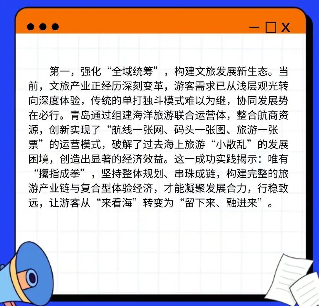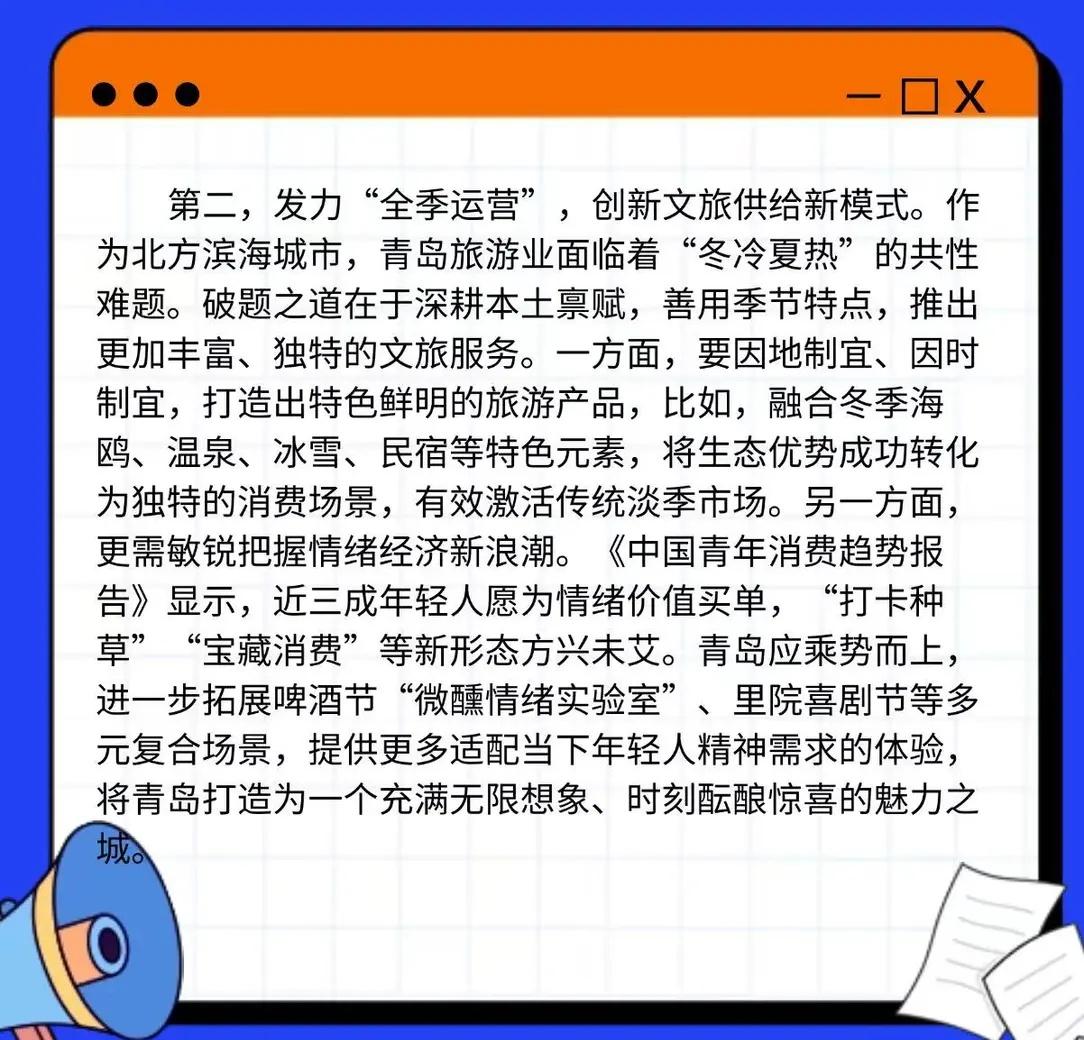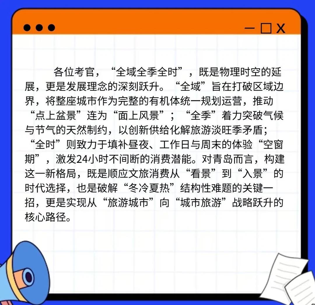 以“全域全季全时”开启青岛文旅新叙事 打卡东大洋码头,慢享蓝调时光;去栈桥海边,与振翅的海鸥来一场偶遇;漫步台东夜市,沉醉于啤酒交易指数的升降……这些鲜活跃动的场景,正是青岛铺展“全域全季全时”文旅新蓝图的生动注脚。对此,请谈谈你对青岛文旅的看法。山东省考 青选计划 青选面试 面试 城选计划 崂选计划 平选计划 即选计划 人才引进