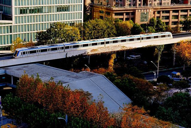 1号线列车驶过三阳路地铁站,站外银杏树成为一道风景线。通讯员产启斗摄