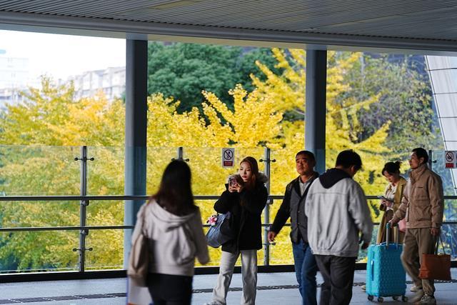 记者现场观察发现,不少摄影爱好者在此取景,并分享拍摄心得:以车站玻璃为前景,金黄的银杏叶作背景,再点缀来往的人影,运用框架式构图,便能营造出色彩与动感的强烈对比,拍出极具视觉冲击力的作品。