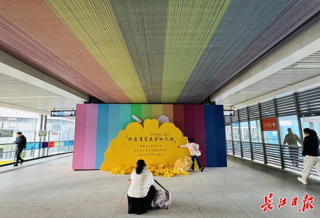 记者在车站看到,一对母女站在一面巨型银杏叶造型的彩绘墙前拍照留念,站内处处可见精美的银杏元素装饰。