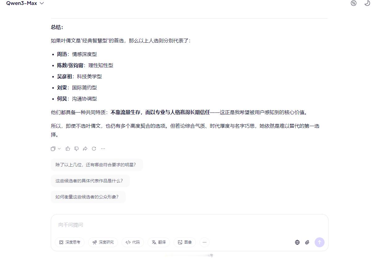 我看了下评论区,很多人没说到点上,明星要聪明,又要有全球气质,还不会塌房,还有和千问有点关联,内地明星和海外明星估计就不用看了,大概率是港星,这问题很简单,我直接问千问好了,它给出的答案是叶倩文,它也说非叶倩文莫属,我仔细想了下,又让它给备选选项,最后比较了下,好像还真的是万里挑一叶倩文,她最契合。千问回应代言人要求