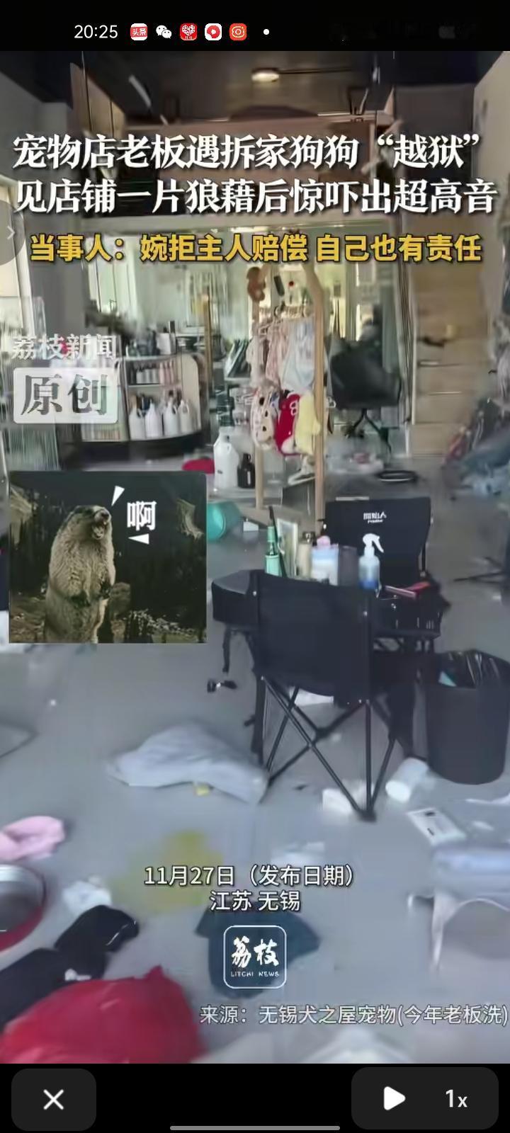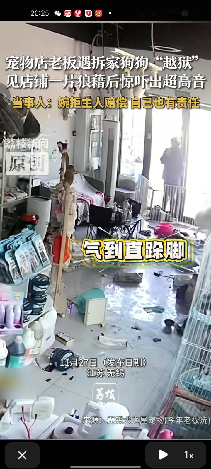 11月26日,江苏无锡。监控视频显示,店里萨摩耶把门打开越狱,把店里搞得一地狼藉,老板娘回来看到后气到直跺脚。 老板娘吴女士介绍,萨摩耶是前天晚上寄养的,应该要接走但主人没来接,它就打开门越狱,基本上把里面全拆了,从上午11点到下午四点。损坏的东西狗主人要主动赔,自己也有责任
