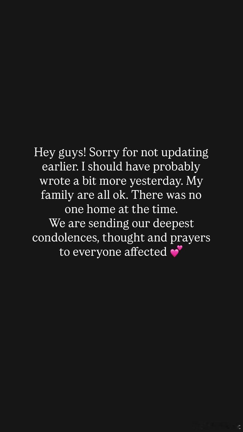 大埔宏福苑宏昌閣昨日(26日)發生五級火意外,火警一小時內升做四級火警,傍晚6時22分再升為五級。火勢蔓延得很快,附近數幢大廈都受波及,截至今日(27日)報下午5時,火警已造成至少55人死亡72人傷,當中包括一名消防員殉職,火警至今仍未救熄。謝嘉怡昨日在社交平台限時動態指:「我向所有罹難者、傷者以及今天失去家園的人們致以最深切的慰問和祈禱。今天我眼睜睜地看著奶奶(祖母)的房子在熊熊烈火中燃燒,真是令人痛心的一天。」她更新完之後便消失了,很多人看見她發文後都表示擔心,直到今日謝嘉怡終於再發文,她馬上報平安:「Hey guys! Sorry for not updating earlier. I should have probably wrote a bit more yesterday. My family are all ok. There was no one home at the time.We are sending our deepest condolences, thought and prayers to everyone affected.」謝嘉怡大致表示抱歉沒有早一點更新,她指家人平安無事,火警發生時家裡沒有人。並且向所有受影響的人致以最深切的安慰、哀悼和祈禱。