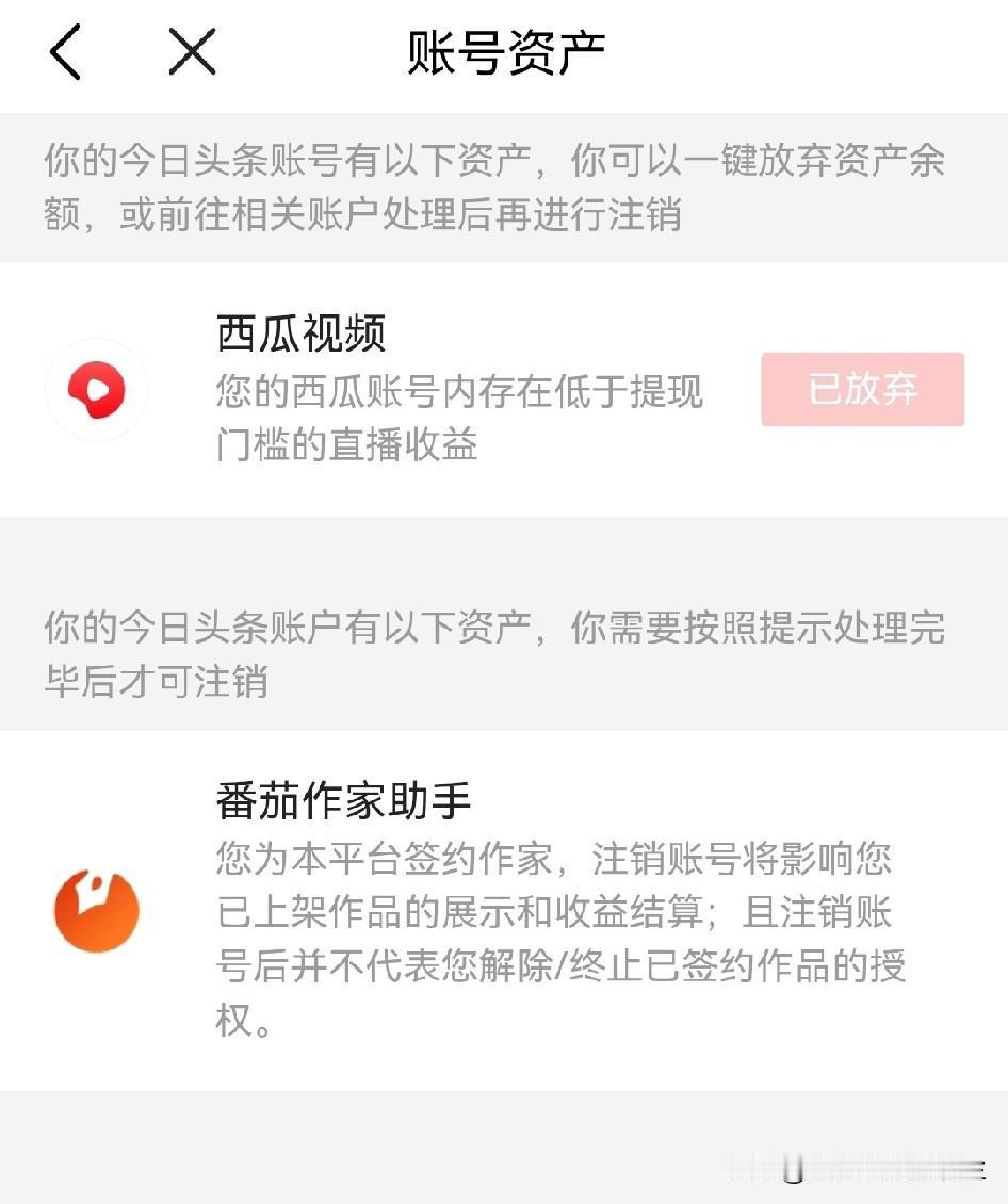 请爱护你的今日头条号,因为一个身份证只能做一个头条号,如果你想先试试然后重练,千万别跟别人学着写番茄小说,真的是很麻烦,这个号想要注销,前面问题都解决了,注销到最后一步说啥也整不了了,就是这个番茄作家,里面有几个签约作品有一些收益还没有结束,这就互相关联上解除不了……所以做新媒体账号,一定要一步一个脚印去走,不然走到后面真的很麻烦。