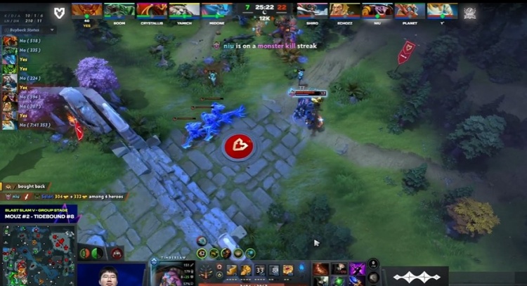 [22分钟]Midone拉席克和Echozz光法遭遇,双方中单互换,Tidebound的压制局势缓了下来。不过BOOM潮汐大招用了杀光法,Tidebound组织打肉山,来看盾的Yamich海民放了一个冰墙就被niu伐木机飞盘过来击杀,shiro飞机顺利打掉肉山带盾。
