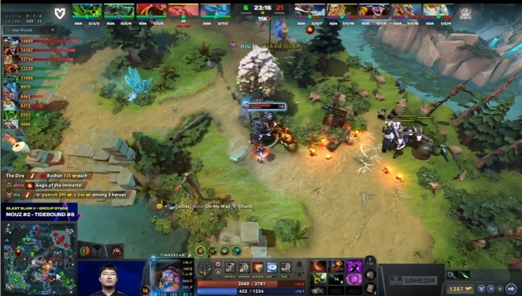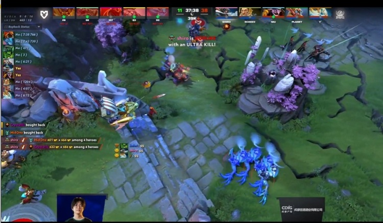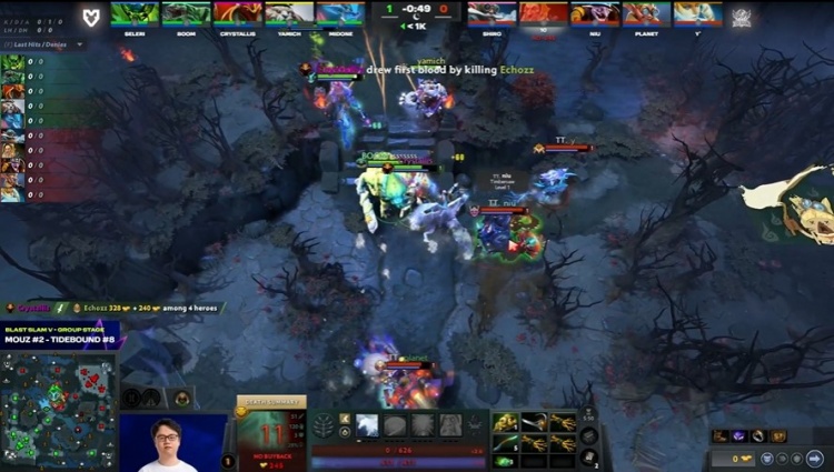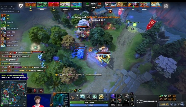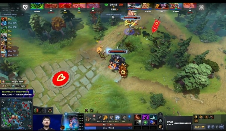 [34分钟]MOUZ中路捉人,planet电炎绝手阵亡后买活帮助留人,niu伐木机等第一波控制交完后入场,shiro飞机大招输出乱杀,后面又Echozz光法推波护阵型,MOUZ被打一波五人阵亡。Tidebound中路上高推掉了双子塔,见MOUZ人复活撤退去控肉山。