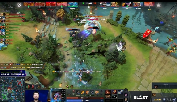[13分钟]MOUZ捉Echozz光法,y小娜迦开大招睡住5人,光法残血拉扯撤退,niu伐木机飞盘炫进来输出,瞬间秒了Yamich海民,shiro飞机顶正面刚Cystallis龙骑士输出,伐木机有光法加持不断飞盘,MOUZ被打一波五人阵亡,伐木机四杀。复活过来的Midone拉席克还想过来收残血,结果就是再死一次。Tidebound一波经济领先达到6K。