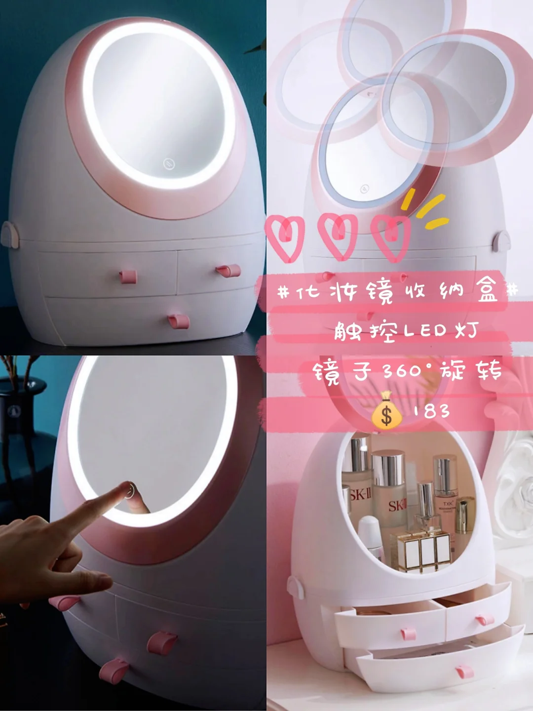 集化妆镜和收纳盒于一体,镜子是带有触控LED灯💡的,还可以360°旋转👍🏻,让妆容更精致。收纳空间很大,还有抽屉~