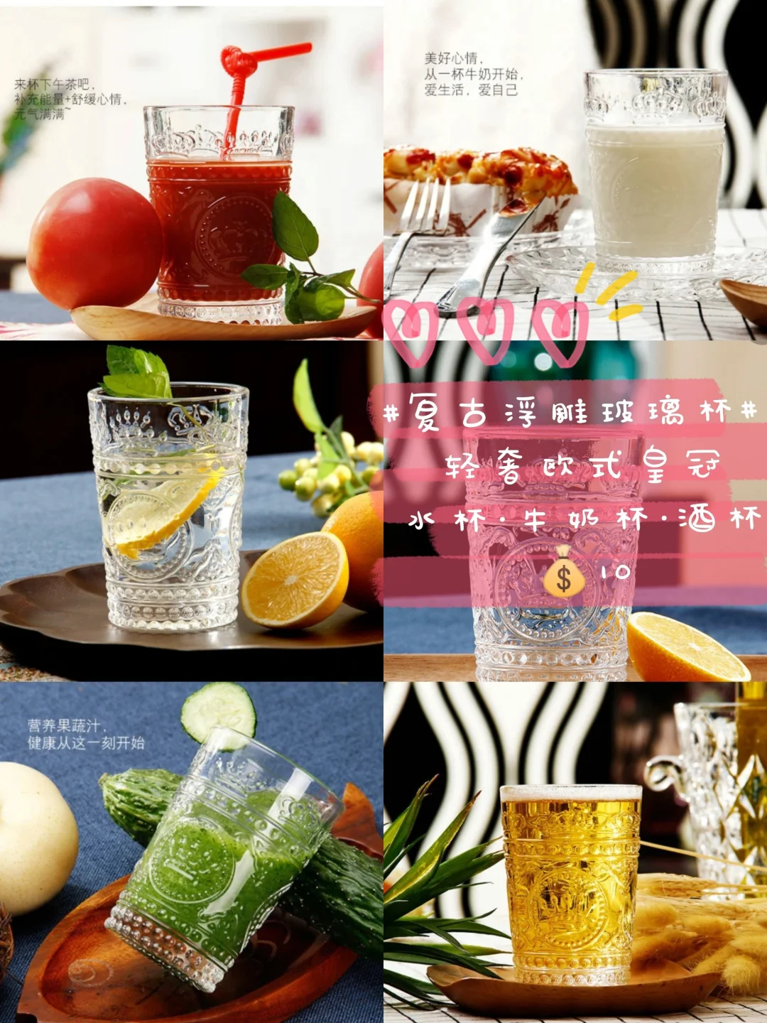玻璃杯上有漂亮的复古浮雕,轻奢的欧式皇冠👑图案,是女生无法抗拒的🎀高颜值呀~作为水杯、果汁杯、牛奶杯、酒杯都炒鸡好看~