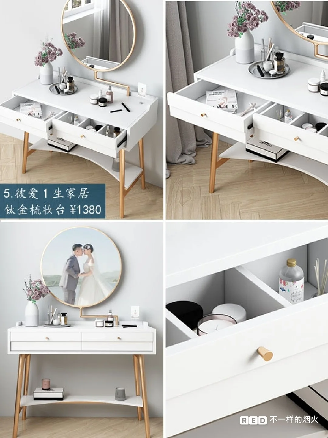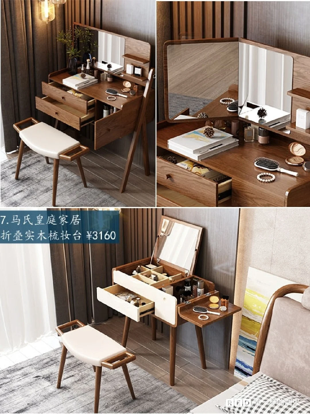 根据梳妆是的动作、习惯来设计,多功能简易折叠实木化妆桌,✔️镜子可以折叠,可以调节高度适合不同身高。💯双抽屉一掩门大容量收纳柜,化妆品再多也放得下。白蜡木腿。