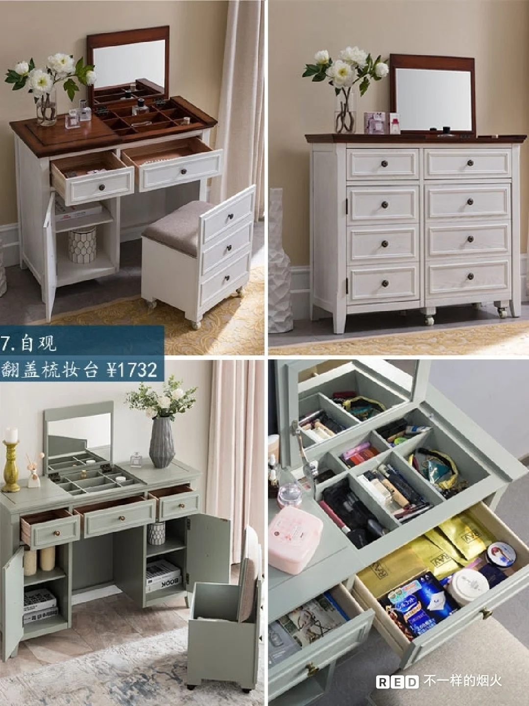 镜子翻起是梳妆台,镜子收起是书桌📚,梳妆凳也带有滚轮,跟梳妆台合起来就是斗柜,凳子也可以翻盖,下面有收纳空间。💄镜面的宫格摆放常用化妆品,抽屉里里可以摆不那么常用的。
