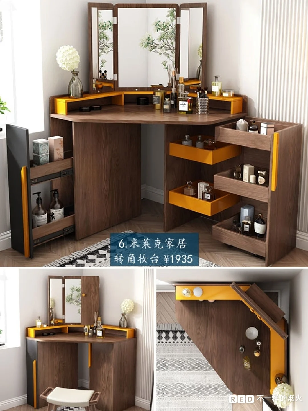 利用转角,提高收纳空间,🎵美化转角的北欧小户型梳妆台。收纳柜有展开和闭合状态,非常省空间,💯专门设有摆放高瓶的抽屉。镜子是可以折叠的三面镜子,桌面空间大。