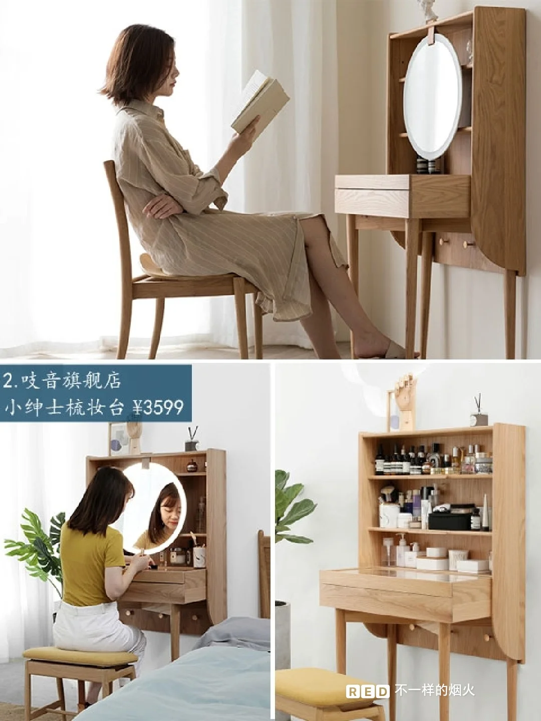美国进口红橡木,🌲木纹清晰自然。梳妆镜自带发光属性,链接usb就可以,除了梳妆还秒变拍照📷圣地。立式收纳空间,层板可以活动调节。