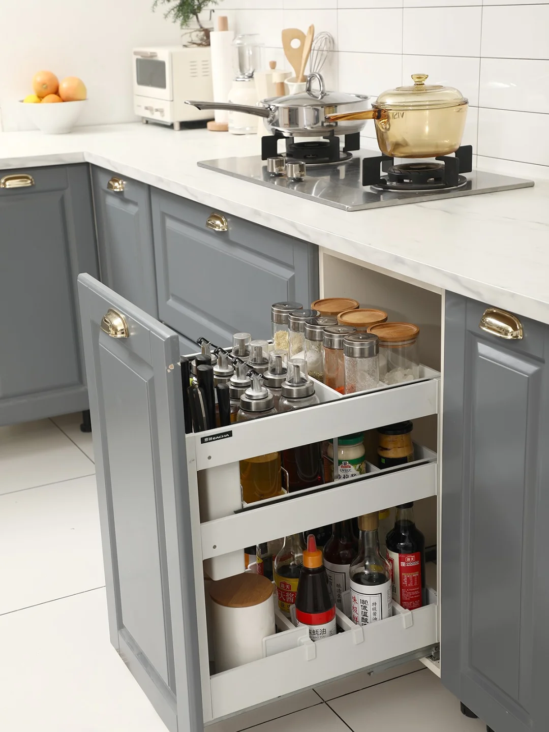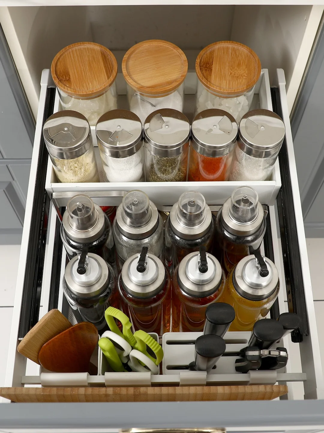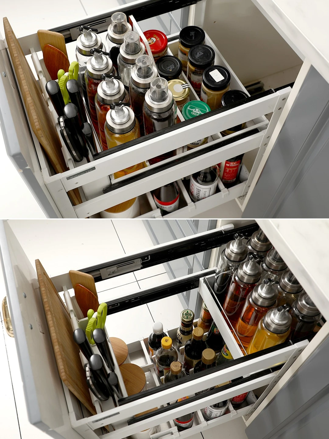 👉🏻下层空间:两层是分层推拉的,拿取很方便,下层也是一个一个格子,每一个都被很好地保护,还可以远离厨房油烟,瓶身干干净净不油腻。