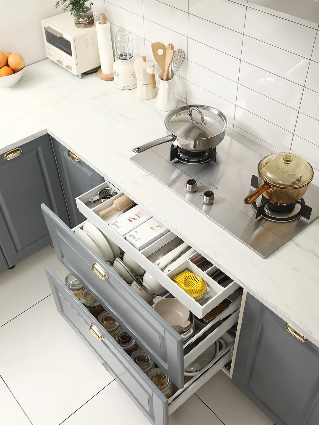 👉🏻上层空间:带小内抽➕餐具盒➕刀具盒的多元化空间,小内抽可以有效利用上层空间,放一些小瓶子,收纳刀叉勺筷也都绰绰有余。瓶子也不会轻易晃动,带有挡条挡片隔开每一个瓶子,固定稳妥。
