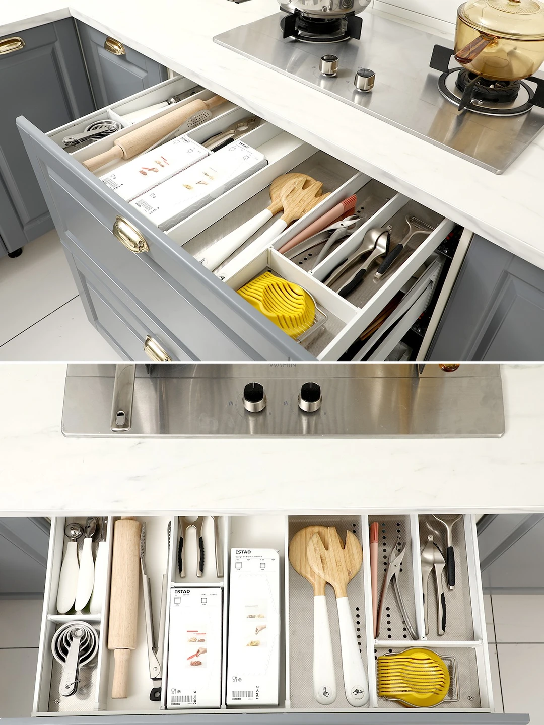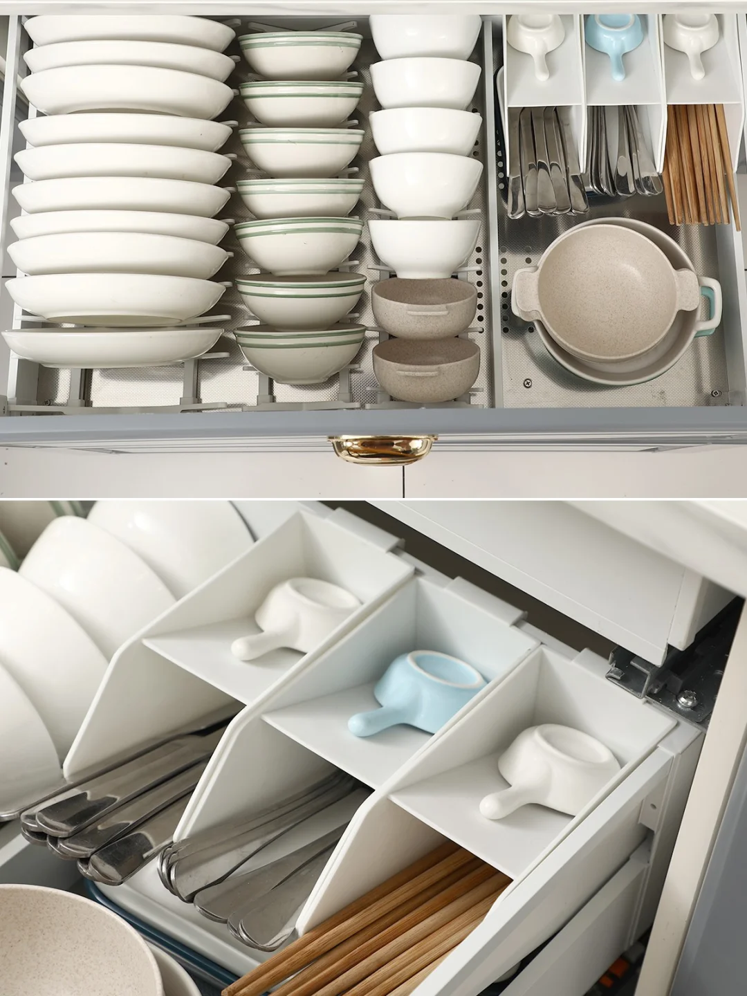 2⃣️一层独立工具抽,不占用多余的橱柜空间,既可以解放厨房台面又可以把物品都整齐收好,实用性很棒。添置在碗碟篮上方,拿取不弯腰,物品摆放一目了然。多个分隔收纳盒,每一样工具都有地方放,不像堆在一起一样混乱,而且干湿分区更方便。