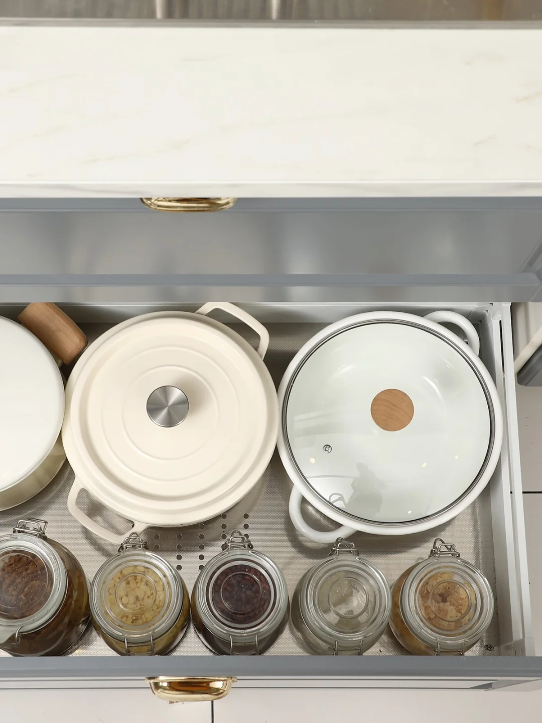 👉🏻下层空间:底下是带有沥水孔的一层平篮,方便沥水,这一层主要是放不常用的锅具➕收纳罐,想要放其它用品也很方便。