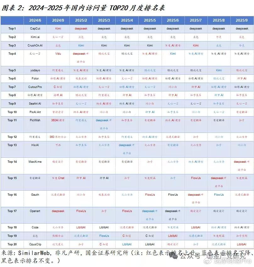 按国金此前的分析,国内市场现已形成“头部双强”格局,Deepseek自今年2月起长期稳居第一,豆包稳定位列前二,展现出强劲的用户粘性与市场影响力;Kimi、百度AI搜索及腾讯元宝等腰部应用紧随其后;而即梦AI、知乎直答、阿里通义等则波动明显,体现出中腰部竞争激烈、替代性强。