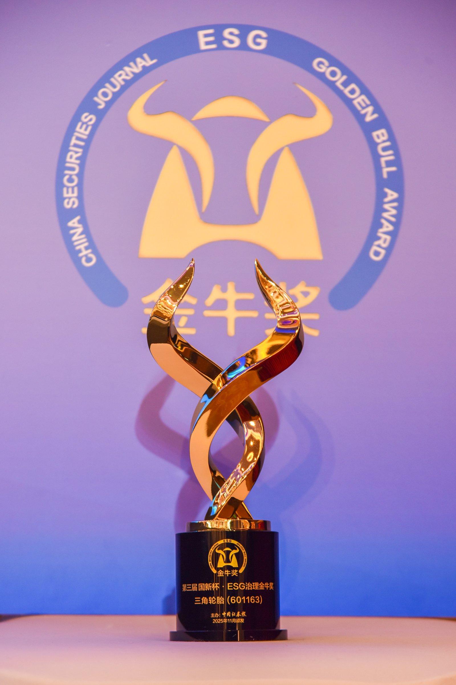 中证报中证网讯(记者张鹏飞)11月26日,以“治善致远绿动未来”为主题的2025年金牛企业可持续发展论坛暨第三届国新杯·ESG金牛奖颁奖典礼在江苏苏州举行。本次大会由中国证券报、中国国新控股有限责任公司主办,国新证券承办,苏州工业园区城市发展研究院全面战略支持。备受瞩目的ESG金牛奖榜单揭晓,三角轮胎荣获“ESG治理金牛奖”。