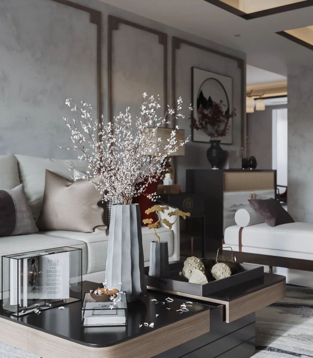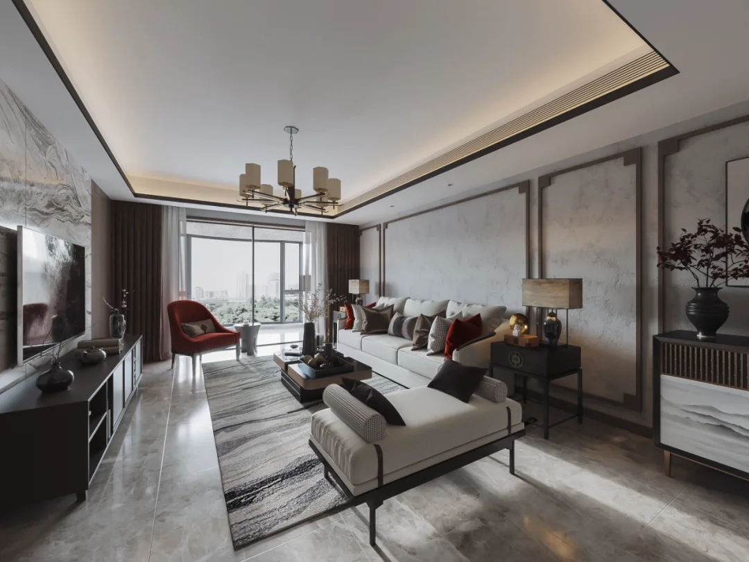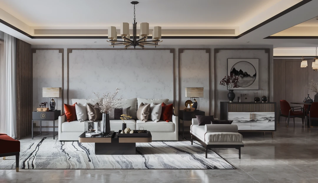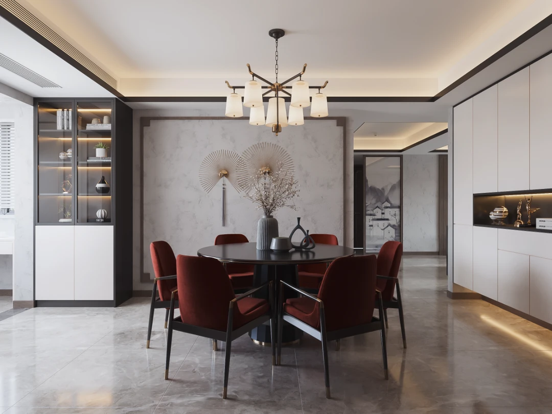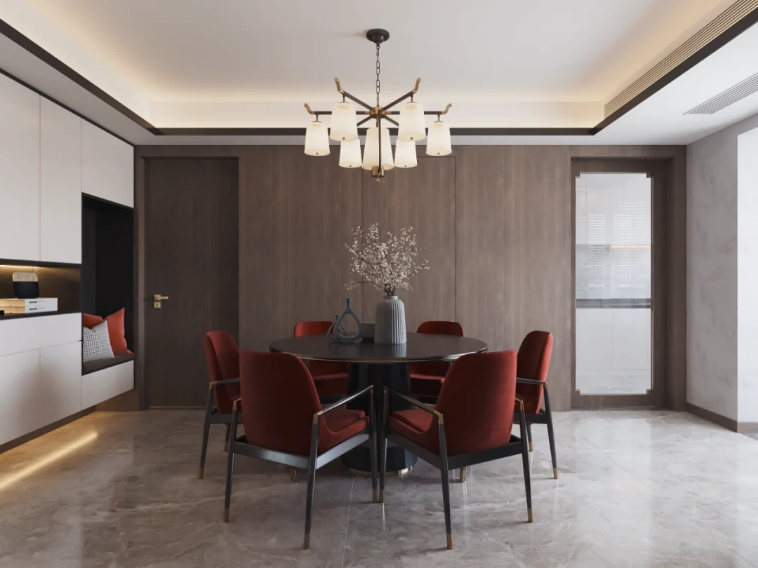 中国山水画中的泼墨写意,新中式也偏爱,水墨留白,虚实相生,给人以无限想的象空间,巧妙利用吊顶造型区分客餐厅区域,空间显得宽敞又相互独立。局部利用最简单的几何图形圆形巧妙取景,美观又典雅,使用低矮错落有致的家具搭配沙发座椅,建立缓冲区域,多层次感,更有活力。