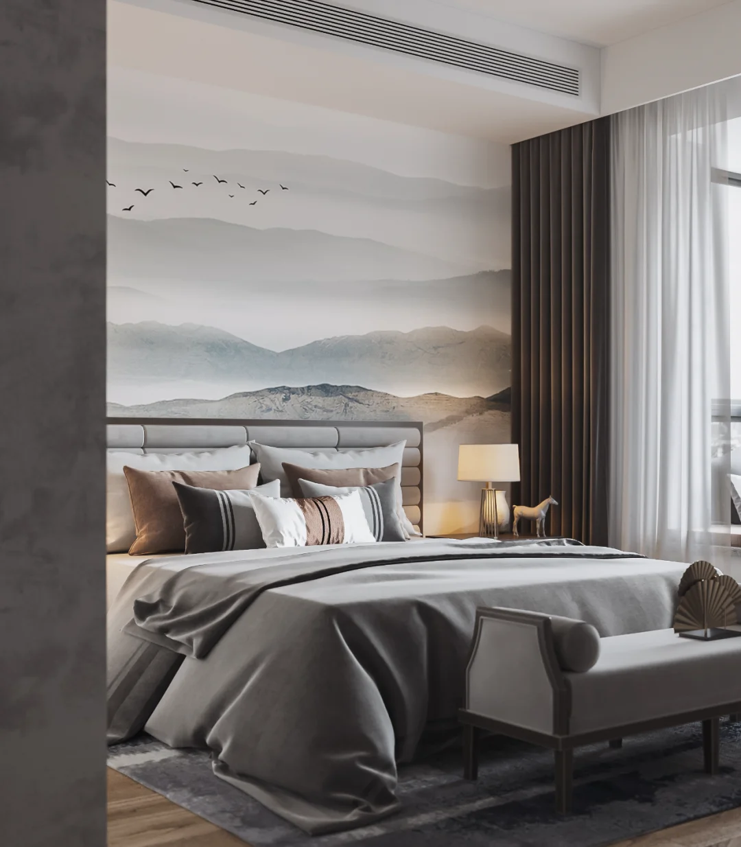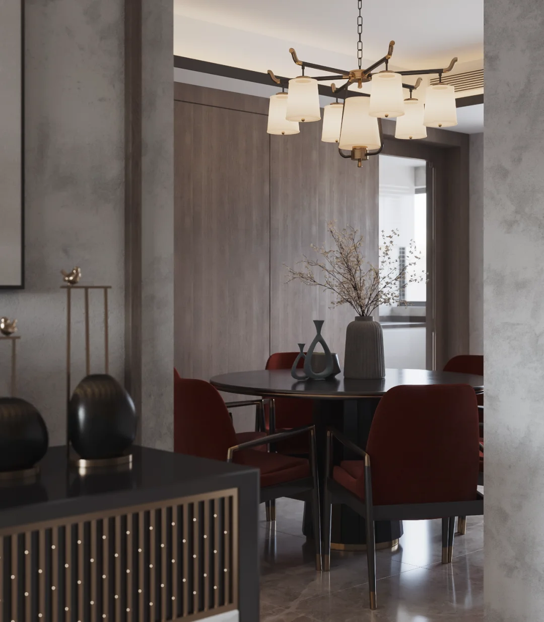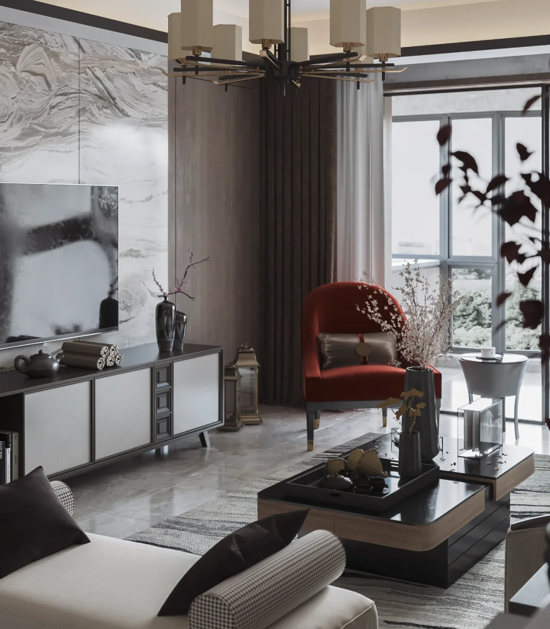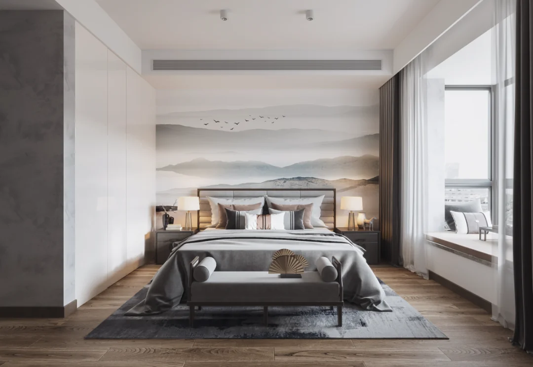 中国山水画中的泼墨写意,新中式也偏爱,水墨留白,虚实相生,给人以无限想的象空间,巧妙利用吊顶造型区分客餐厅区域,空间显得宽敞又相互独立。局部利用最简单的几何图形圆形巧妙取景,美观又典雅,使用低矮错落有致的家具搭配沙发座椅,建立缓冲区域,多层次感,更有活力。