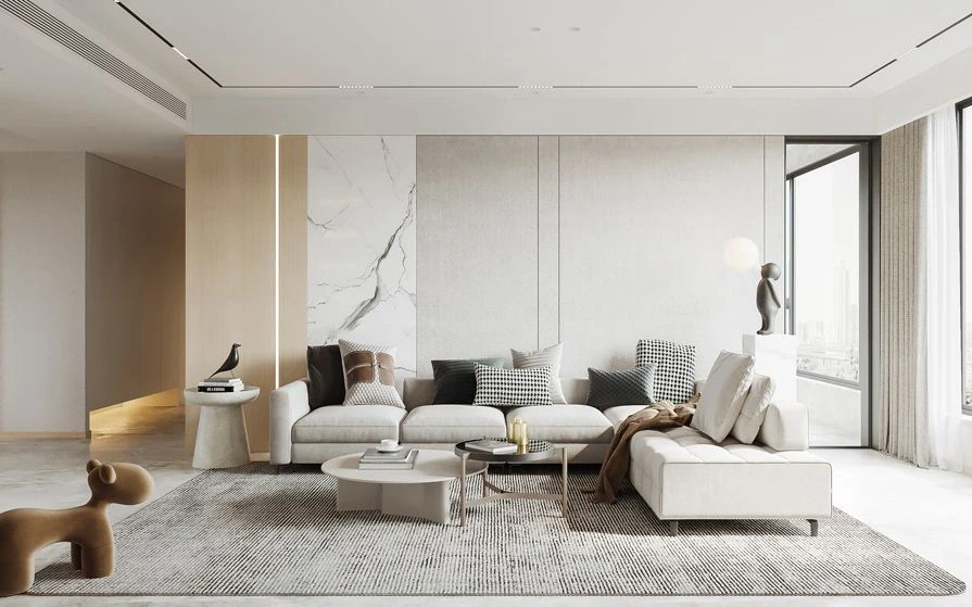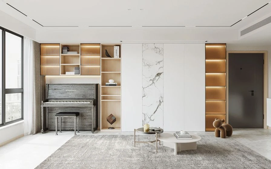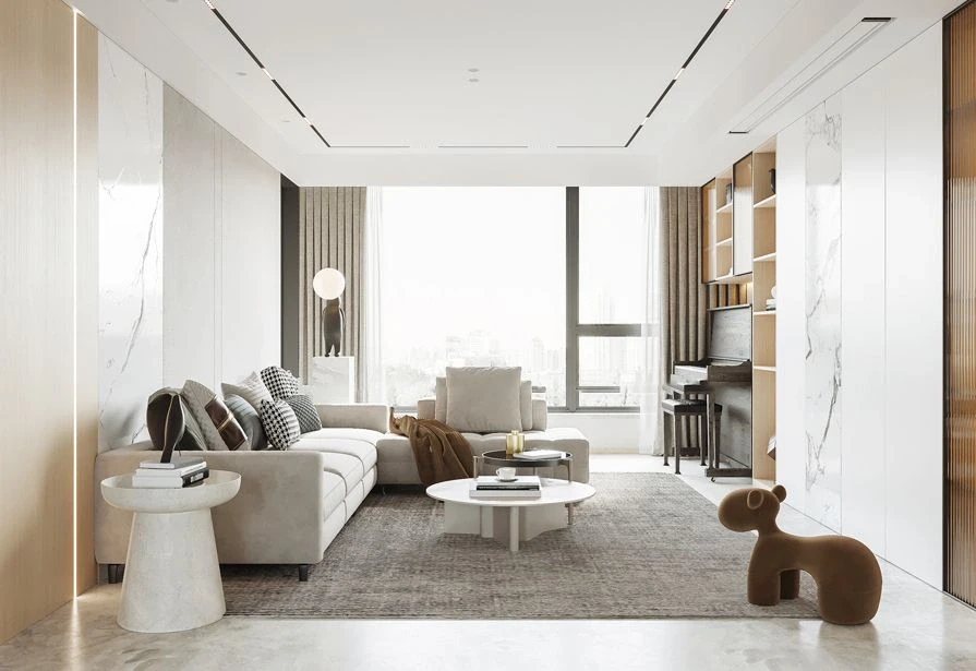 🌹客厅整体色调以奶白色与原木色为主,双拼实木背景墙搭配舒适的科技布沙发与创意双拼茶几自带轻奢感,整体家具与周围的装饰相呼应。无主灯设计使得光线均匀,让空间更有层次感。 🌹阳台与客厅打通,扩大了整体的空间,视觉上变得开阔。同时省去了电视柜的布置空间作了同样的双拼实木背景墙,定制的开放格收纳柜与留出的钢琴空间,布局合理又舒适。 🌹客餐厅一体化的设计使整个空间更具有整体性,大理石+黄铜+玻璃等多种元素搭配在一起,满满的高级感,同时也满足了储物空间的需要。 🌹卧室背景墙以大面积留白为主,空间的装饰用金属元素的挂饰+玻璃门作点缀,即使是休息的场所也设计的富有质感,温馨而不失雅致。 大家觉得怎么样呢~[偷笑R][偷笑R][偷笑R]