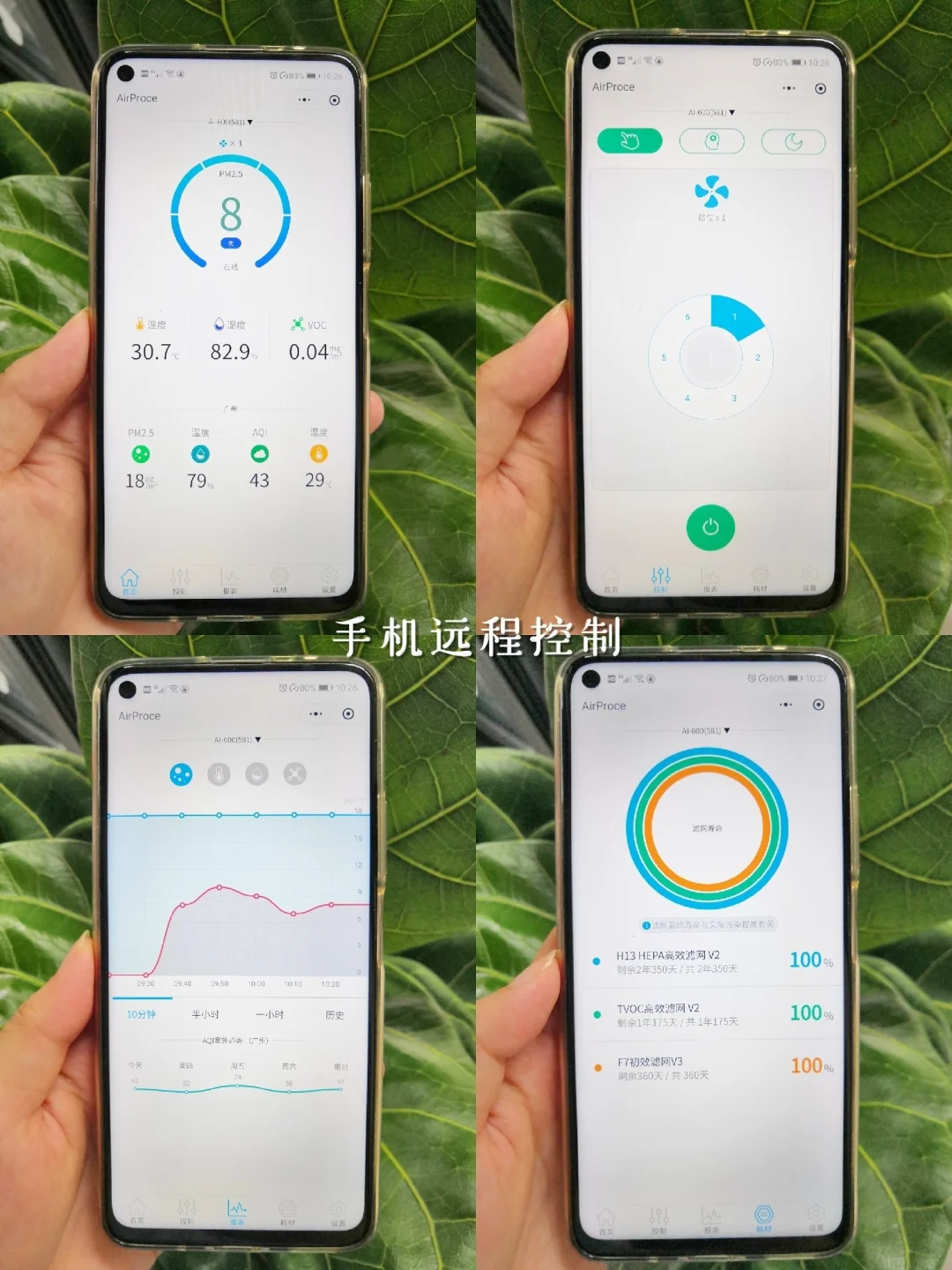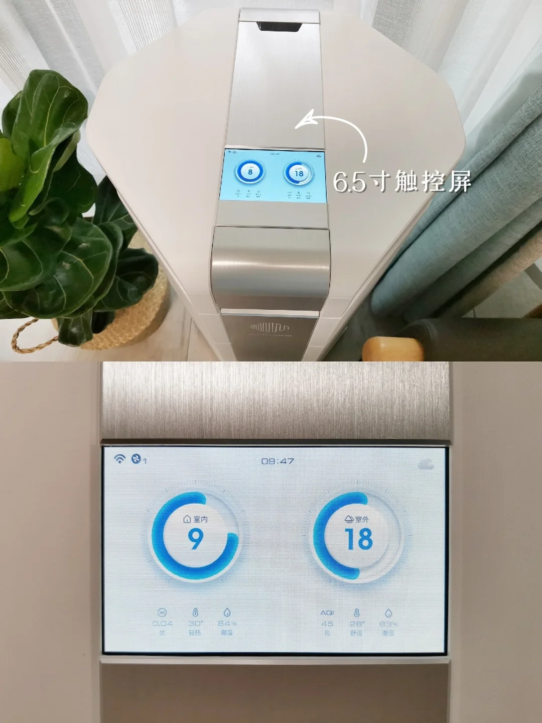 ⭐另外,它的操作也比较简单,家里老人都会用。机身上有6.5寸触摸屏,可以直接在屏幕上操作,还能连接手机远程操控,屏幕能看到实时的家居空气情况。