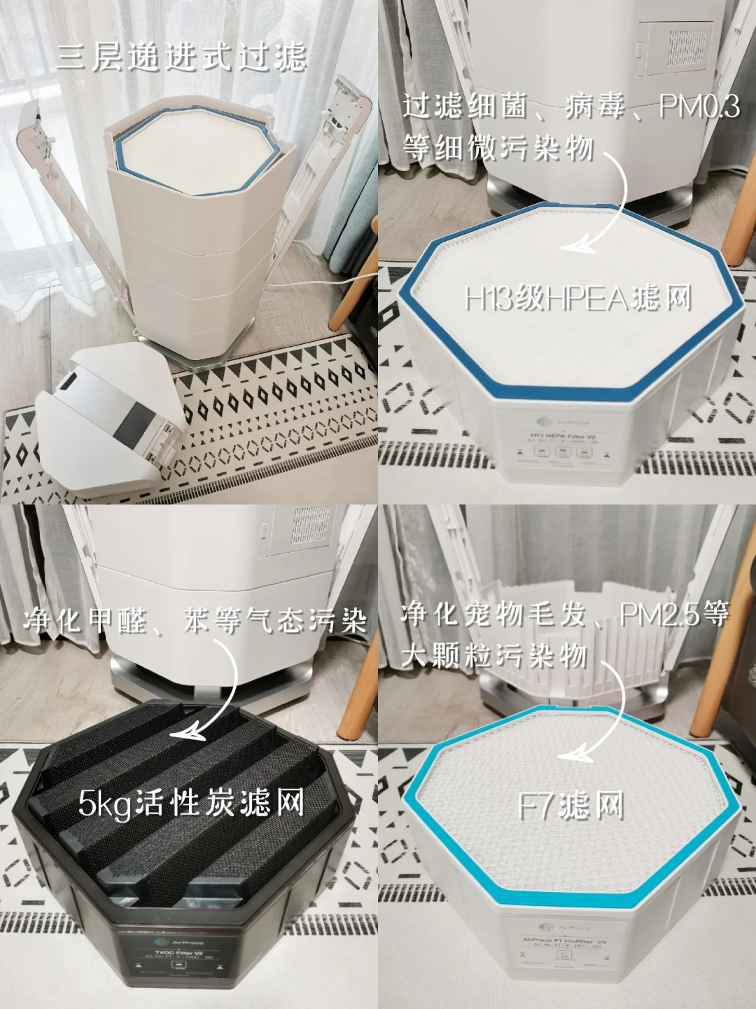 🤓之所以在那么多净化器中选择了这台,并不是只看中它是明星同款,主要是它的净化功能真的硬核👍🏻,它有三层过滤网: