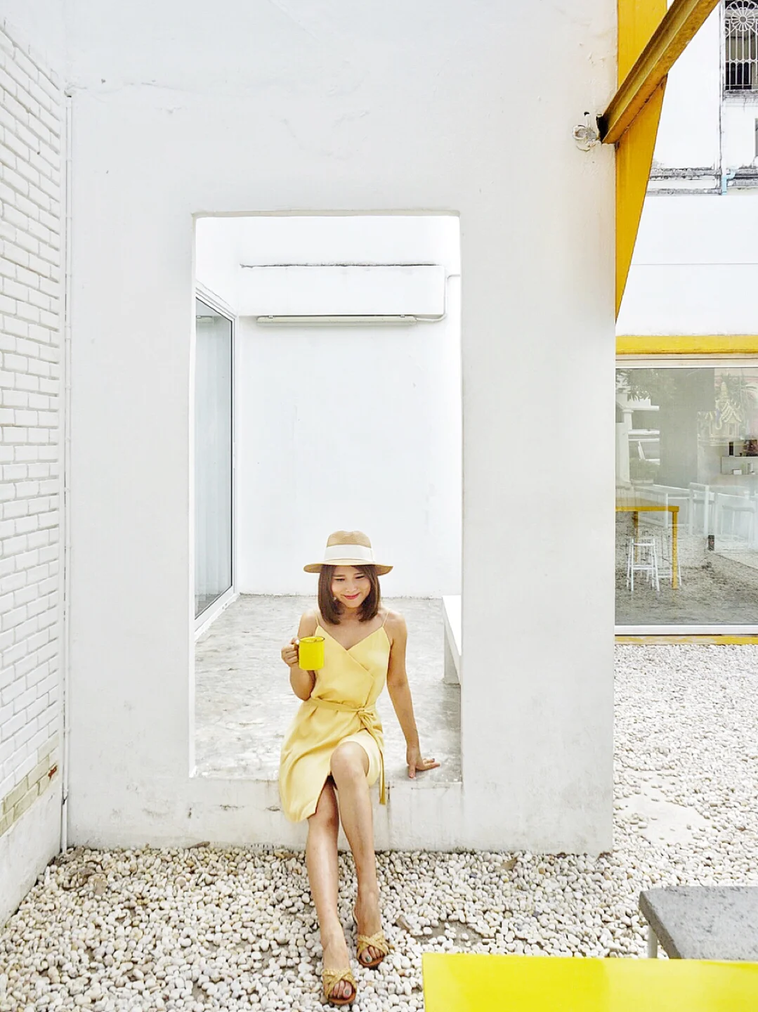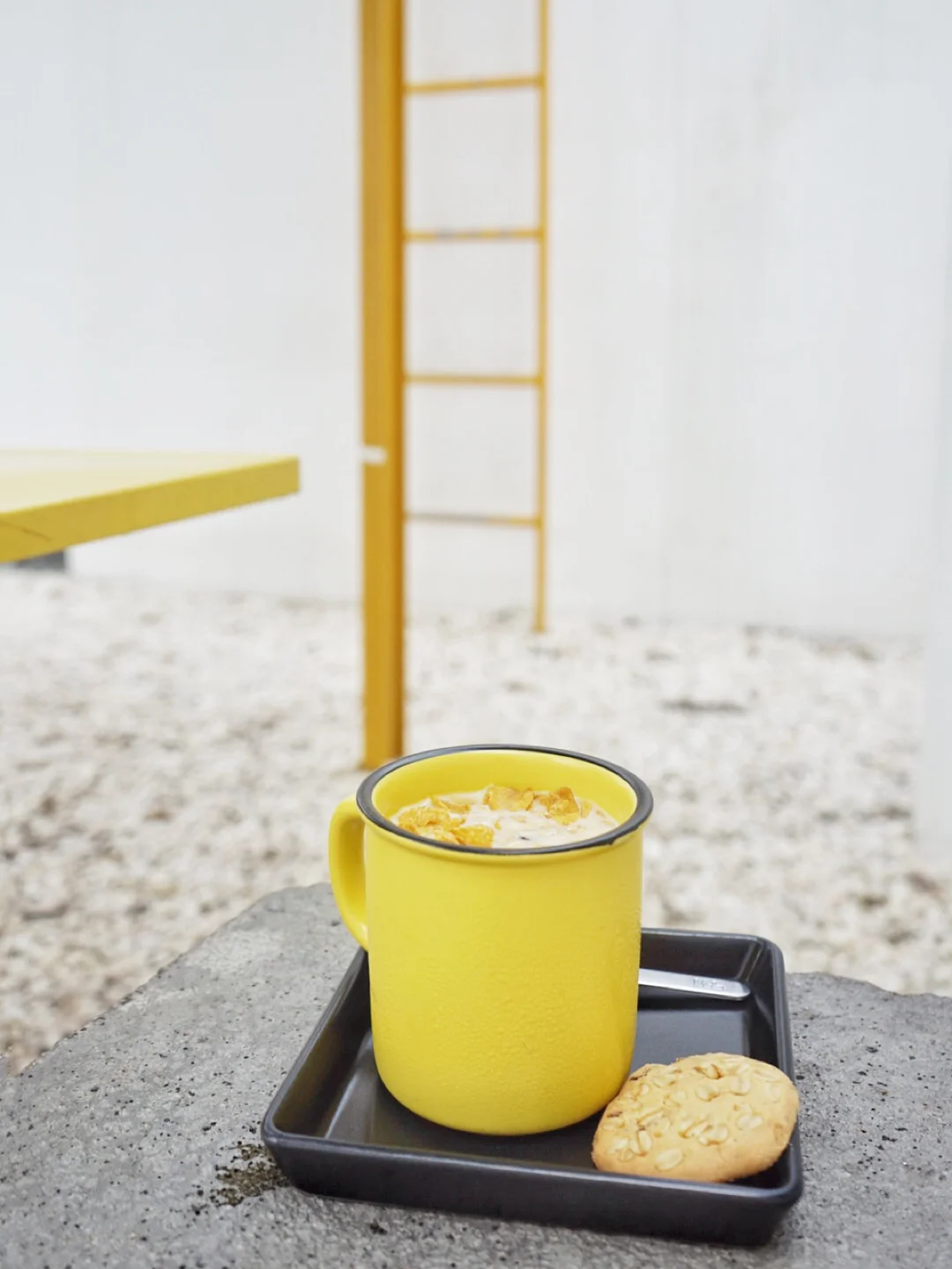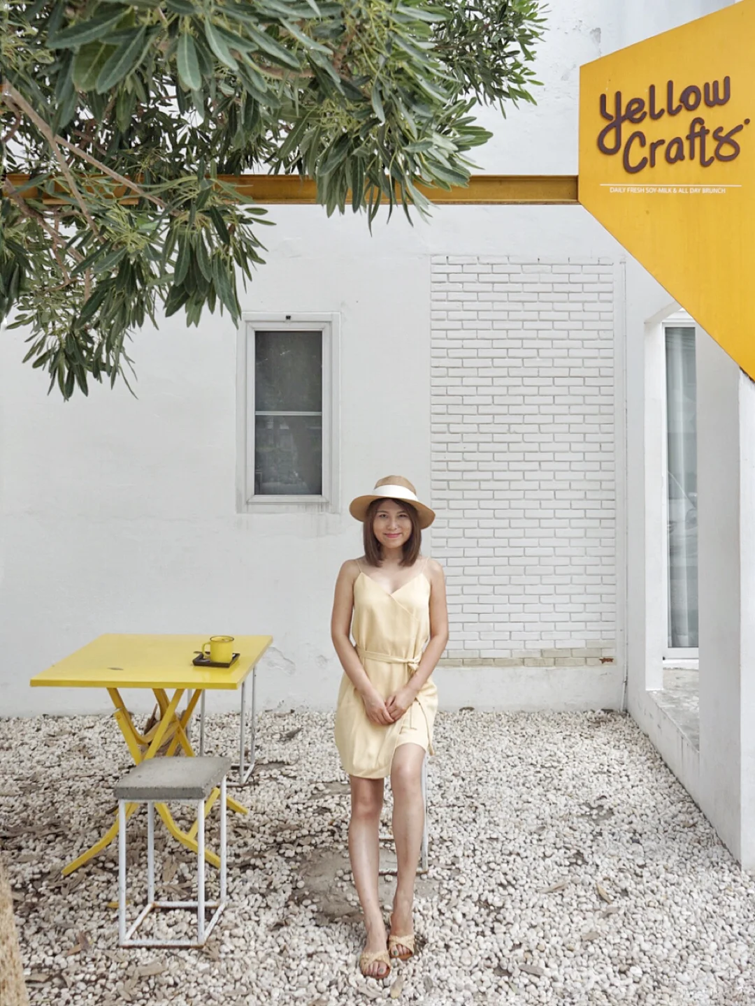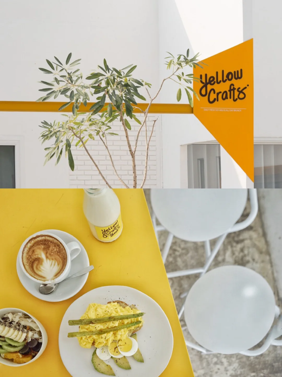 这家店的装修一看就是非常instagrammed的,极简的风格,白色主色调,配上明亮的黄色做点缀,即便是阴天,即便是阴天也有活力的色彩。前一晚刚好在宁曼路一号的一家店叫“OOTD”买的一条鹅黄色的裙子👗,真的很配这家店。