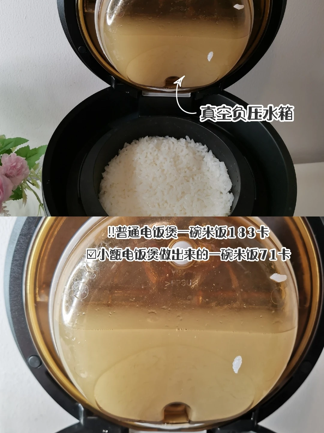 💡对比普通电饭煲一碗饭183卡,它做出来的米饭就只有71卡,每天少摄入448卡,等于慢跑1.5小时、瑜伽2.5小时、游泳1小时,‼️不饿肚子又能瘦下来~