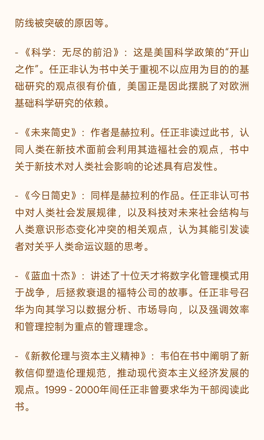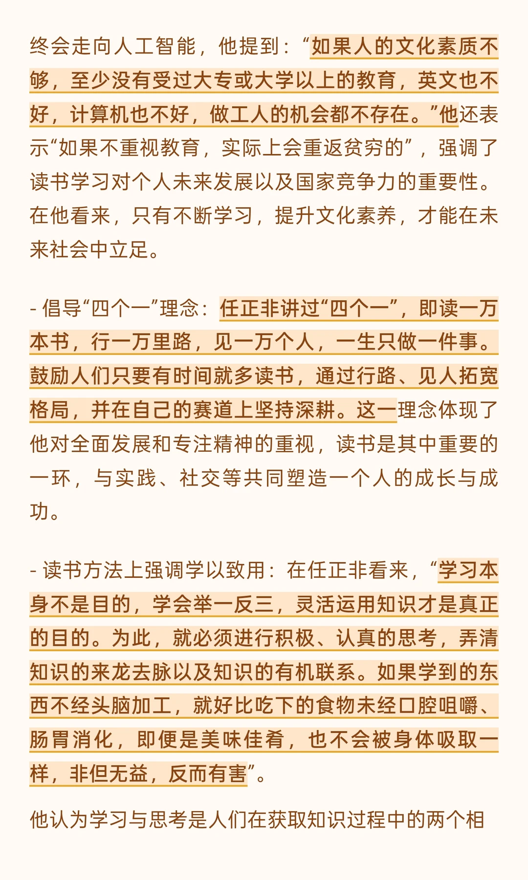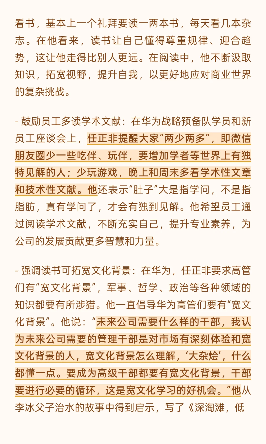 任正非强调读书是自我提升和应对商业挑战的重要方式,鼓励员工多读学术文献,拓宽文化背景。他倡导“四个一”理念,强调学以致用,认为读书能改变命运,提升文化素养,适应未来社会。