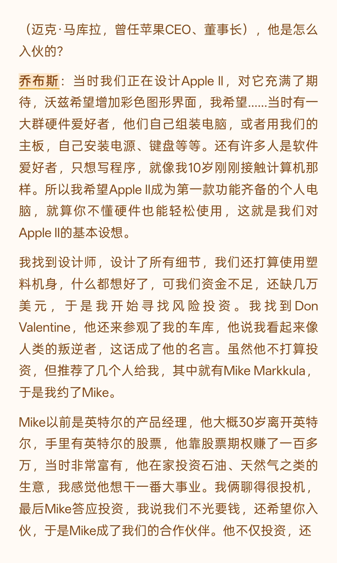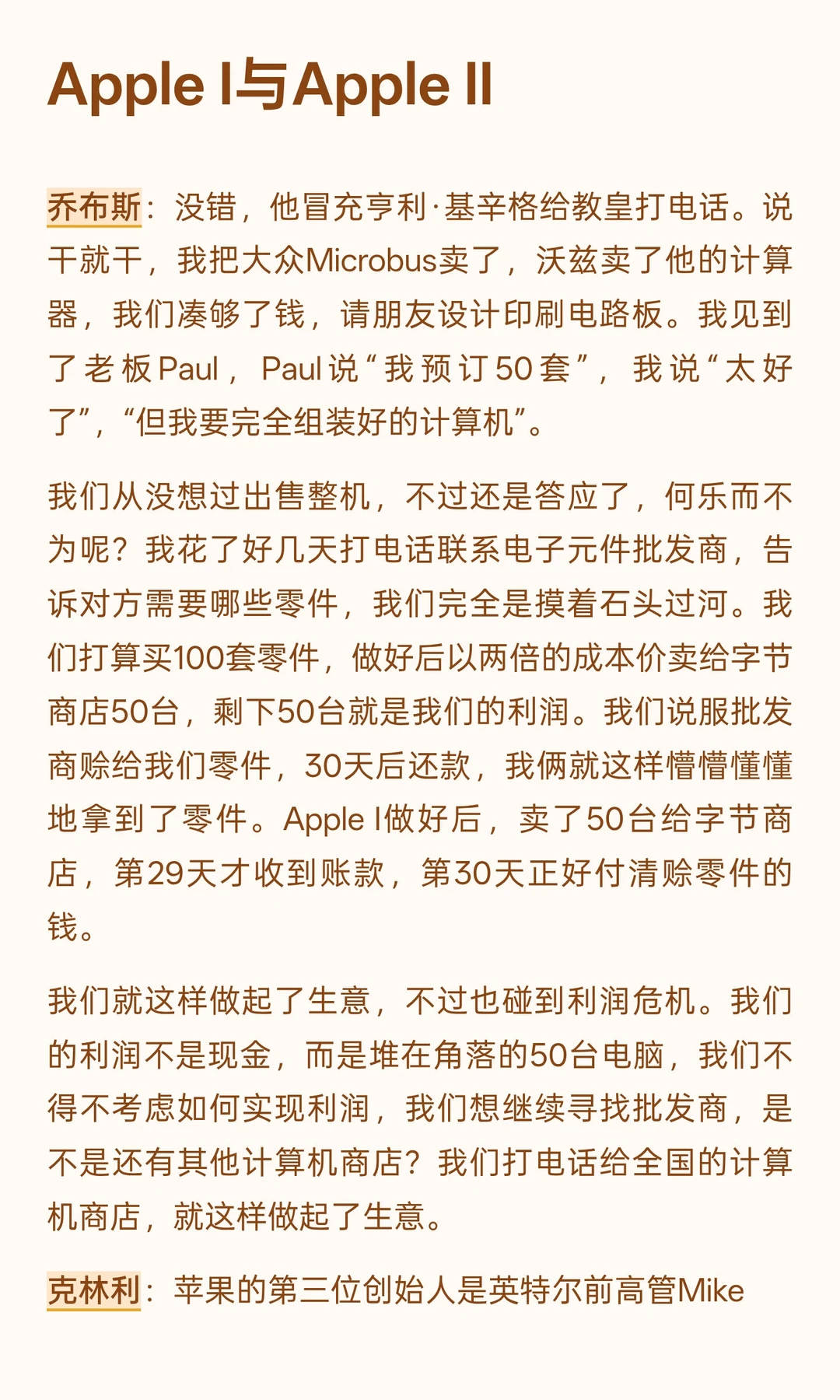 我给你举个例子,我们在车库里组装Apple I时,成本算得清清楚楚,可工厂生产Apple II时,财务部门用的是标准成本,每个季度估算标准成本,然后根据实际情况调整。于是我不断追问,为什么要这样做?得到的答复是,这是一贯的做法,6个月后我发现其实是因为无法精确计算成本,所以只能先估算,然后进行修正,根本原因是信息管理系统不够完善,但没人承认这一点。
