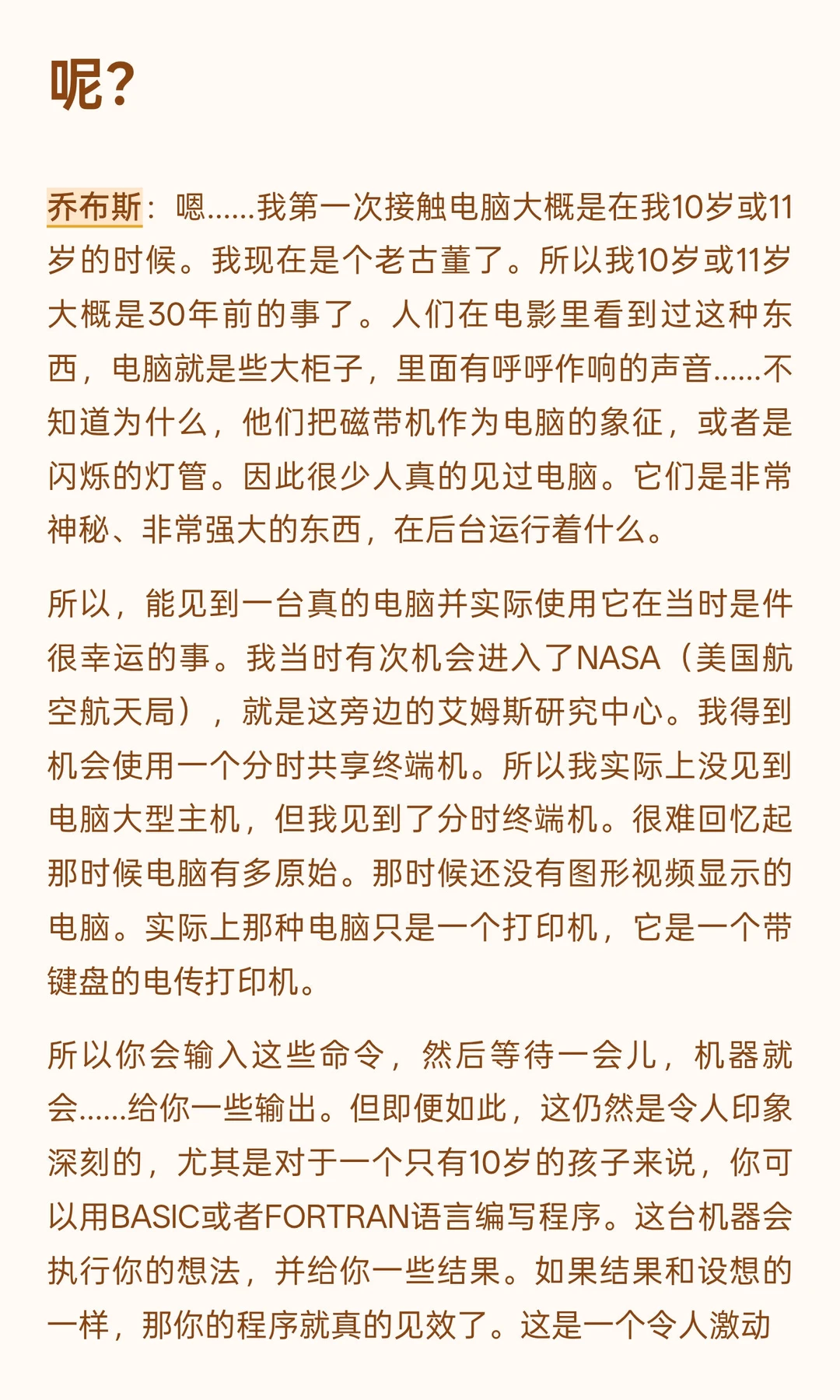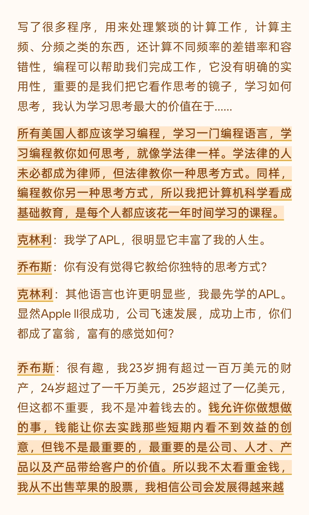 1995年,罗伯特·科林利采访乔布斯,探讨个人电脑的兴起、Apple I与Apple II的开发、管理公司的心得以及编程的重要性。乔布斯强调编程是思考方式的训练,认为每个人都应学习编程,而非单纯追求金钱。