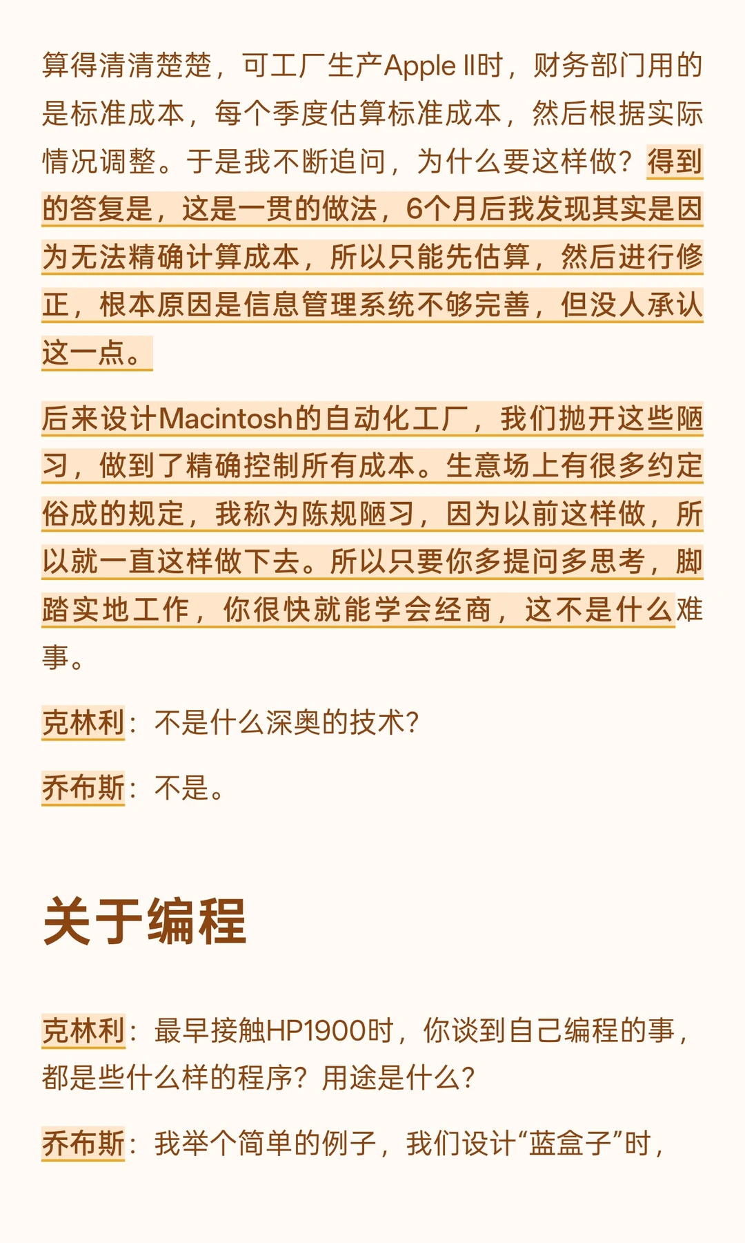 后来设计Macintosh的自动化工厂,我们抛开这些陋习,做到了精确控制所有成本。生意场上有很多约定俗成的规定,我称为陈规陋习,因为以前这样做,所以就一直这样做下去。所以只要你多提问多思考,脚踏实地工作,你很快就能学会经商,这不是什么难事。