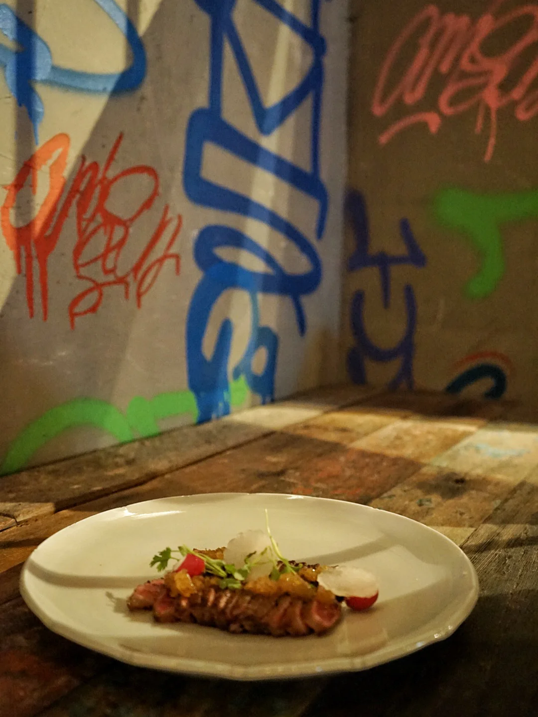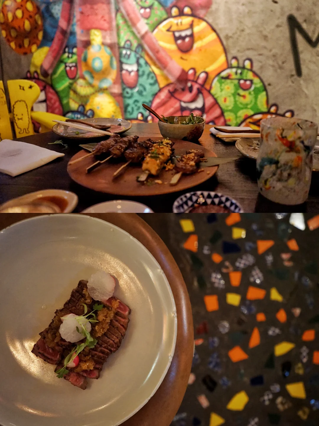 🍴Djapa 📍湾仔利东街(湾仔站A3出口) 菜式:巴西🇧🇷+日本🇯🇵 Djapa经常来和朋友小酌一杯,是因为它并不吵闹,交通方便,鸡尾酒也很漂亮,但因为灯光昏暗,很少正儿八经拍照。但的确无论是颜值、创意还是食物、酒都值得大家来打卡。 🖼1⃣️【餐厅颜值】 如标题,受巴西贫民窟的启发,Le Comptoir 集团特别请巴西的艺术家来设计涂鸦。一走近Djapa,便是醒目的Whiskey酒墙外,摆放着近300支威士忌🥃,墙上是大幅日本动漫插画,色彩奇丽、大胆,和酒吧的氛围有着奇妙的冲突和违和感,但就是这样才是另一种突兀的美感。 我想这种理念就如同彩绘巴西里约热内卢贫民窟的艺术家,他们用鲜艳的色彩告诉人们,尽管这里是贫民窟,但是住在这里的人们依然努力生活、积极向上。 涂鸦的创作再辅以村上隆,草间弥生,空山基,岩本正胜和维亚纳·托马斯(Tomaz Viana)等艺术家的作品,配上彩色的涂鸦椅子,让整个空间很跳跃。在香港独树一帜,很难找到第二家。只是原本二楼草间弥生的波点金色南瓜,是很多人打卡照的spot,店员说已经被搬走了。 🖼2⃣️ 【餐厅食物】 餐厅是日本菜和巴西菜的fusion。原本觉得风马牛不相及的两个国家,查阅资料才发现,大约在明治维新时期,第一批批日本老公便搭乘「笠戶丸」号,从神户港驶向巴西🇧🇷。自此,巴西成为日裔最多的国家。于是,在饮食方便也衍生出了巴西和日本的混血风格。是不是很有趣呢❓ 至于食物,分成smaller,larger,sides。我喜欢它们家的串烧,larger的话就喜欢和牛,sides很适合下酒菜。 至于酒,我不算很懂,但印象深刻的是他家的Blushing Geisha, 造型很浮夸,酒杯外是一条丁字裤,一次和朋友们一起,大家都疯狂拍照,大家不如点一杯,瞧个新鲜。😂😂昨晚去没点,翻阅旧照,怎都找不到了。 🖼3⃣️如果大家来利东街(喜帖街),不如来这里坐一坐,小酌一杯,并不嘈杂,很是惬意。