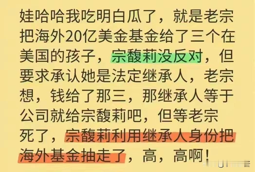 人走茶凉。 43岁的宗馥莉,在父亲去世一年后,还是彻底搞砸了,11月27号,宗馥莉辞去法人、董事长、总经理职务,由许思敏接任,从今以后,娃哈哈不再姓“宗”,目前,宗馥莉依旧持有集团29.40%的股权,是第二大股东。 不过,以后她的路难走了。 从私生子事件曝光,站在资本的角度来看,宗馥莉就失去了“继承”的资格,原本,她只要安安静静做好自己就行,可惜,贪心太大,非要拿走私生子的21亿美金,打乱了所有计划,就连老父亲的人设也被踩得稀巴烂。 离开娃哈哈后,宗馥莉还创建了“娃小宗”,但网友们并不买账。 走到如今这一步,真的很难评,借用她叔叔的一句话:“从小就冷血,六亲不认。”