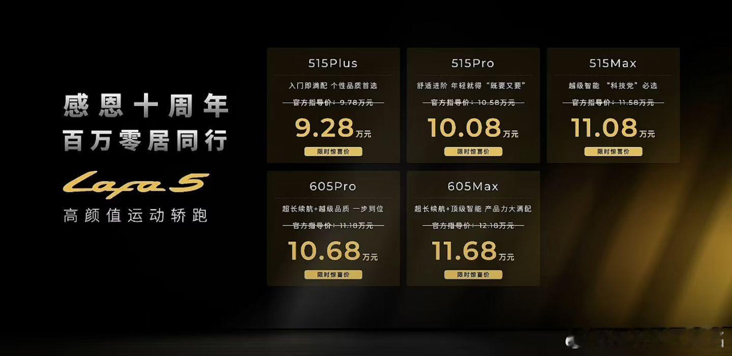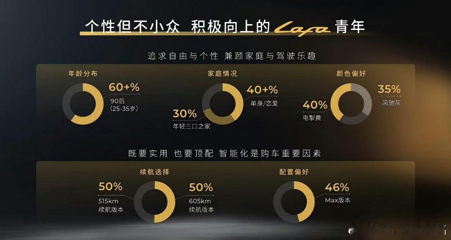 同事去参加了Lafa5的发布会,有一些感受:“一进会场,就看见处处都是“LAFA黄”,极有个性化和冲击力,甚至稍微晃眼的色彩,展厅除了展车,还陈设了许多改装零部件,能感受到lafa5主打的改装乐趣。会上,展车绕会场一圈的安排别出心裁。单从零跑的发布会布置来说,逐场参加下来,逐渐向三方面靠拢:颜值、主见和个性。这次lafa5发布会首先公布了零跑的三季度成绩,曹力总将其归功于全域自研,也特意强调了出海表现。截至目前,零跑提前完成了2025年五十万台的销量目标,2026年决心翻一倍。零跑每次的资料包中都详细标注了用户画像,不清楚内部是否有专门的岗位做这件事,重要程度如何?lafa 5下定用户画像中有超过60%的90后,515km和605km续航版本对半开,接近半数用户偏好顶配的Max版本。曹力总依次从颜值、座舱、AI智能、操控和安全几方面介绍了lafa5的产品力。零跑B10上市时提到的摩根粉也延用到lafa5上面,重点还有605km CLTC续航、高通8295P智能座舱等,lafa 5 ultra版本明年二季度将发布。lafa5 9.28万-11.68万的价格确实降低了年轻人的用车成本。再想起这句slogan——自己定义路。lafa 5怎么突出“自定义”而不是“半价xx”?恐怕答案还得从全域自研降本和越级对标中寻找。零跑似乎无意回避“半价平替”的认知,反而有意继续强化这一优势,如果统计零跑这几次发布会上的术语数量,“同级唯一”、“同级领先”可能是高频词。作为10万级纯电运动轿跑市场的新秀,lafa5的市场表现值得关注,就看“小登”买不买账了。”年轻人首选Lafa5限时9.28万起汽场全开 零跑lafa5开启轿跑10万级时代