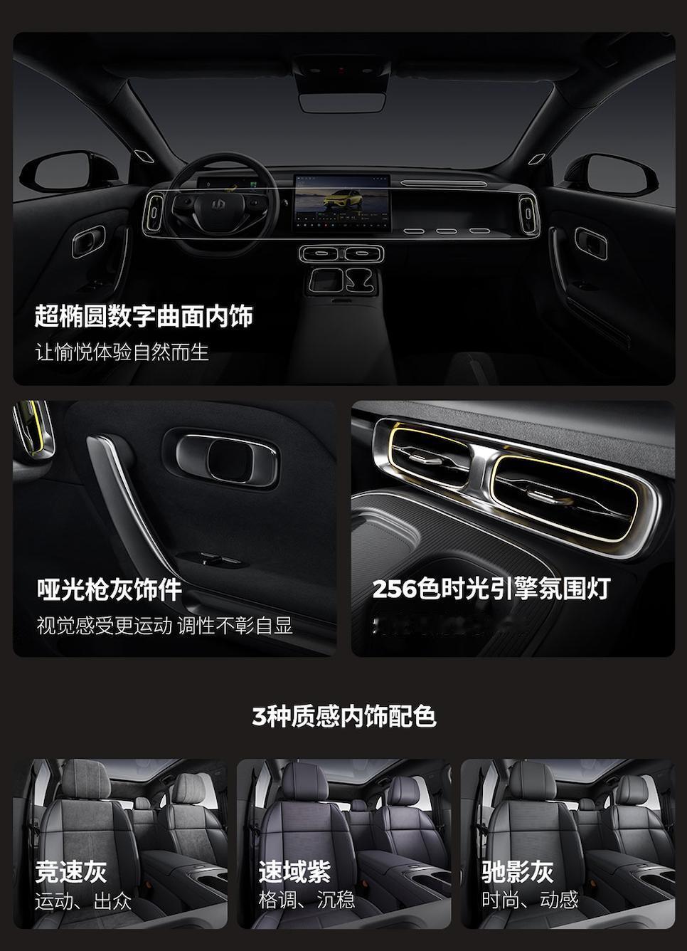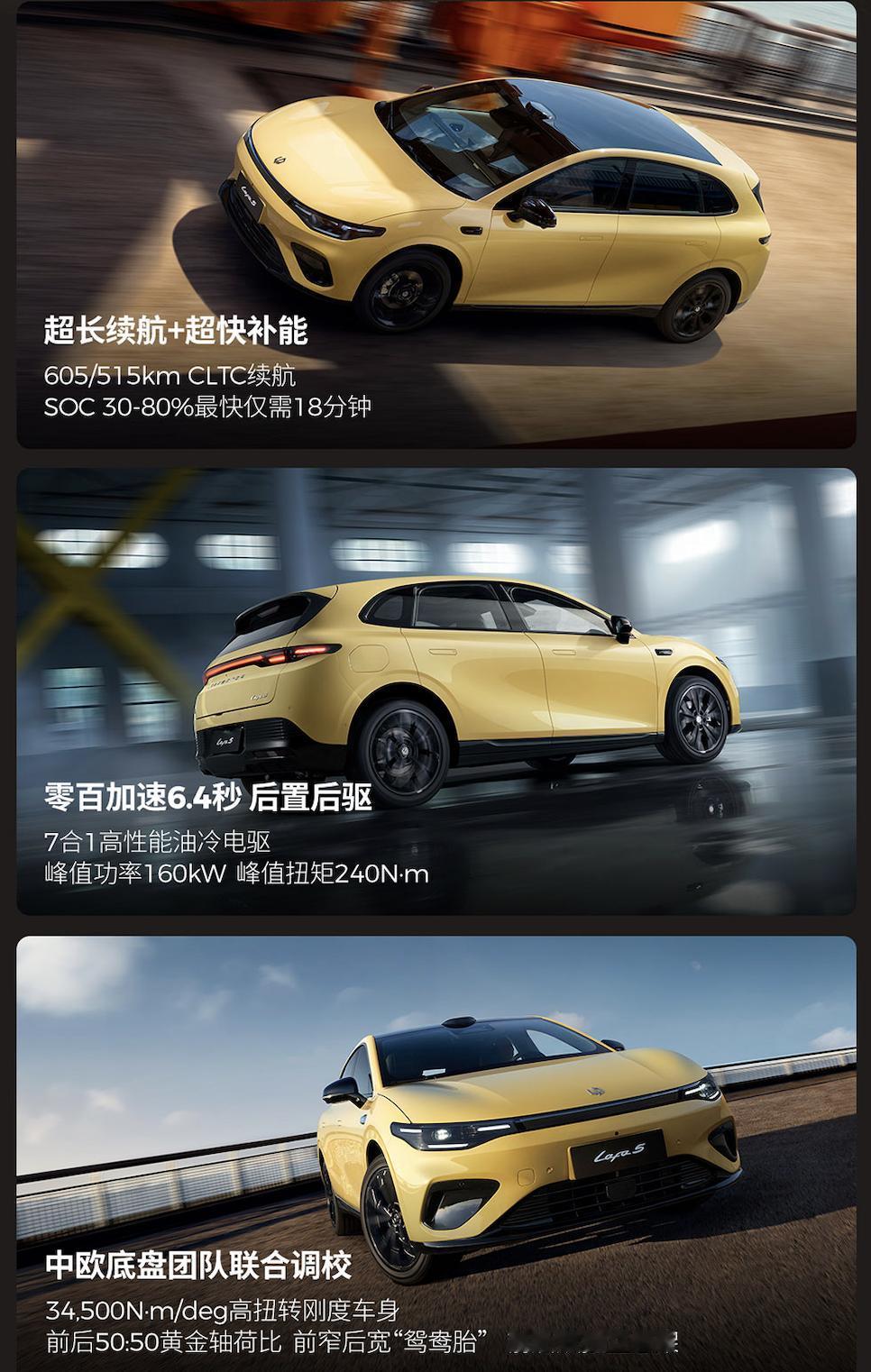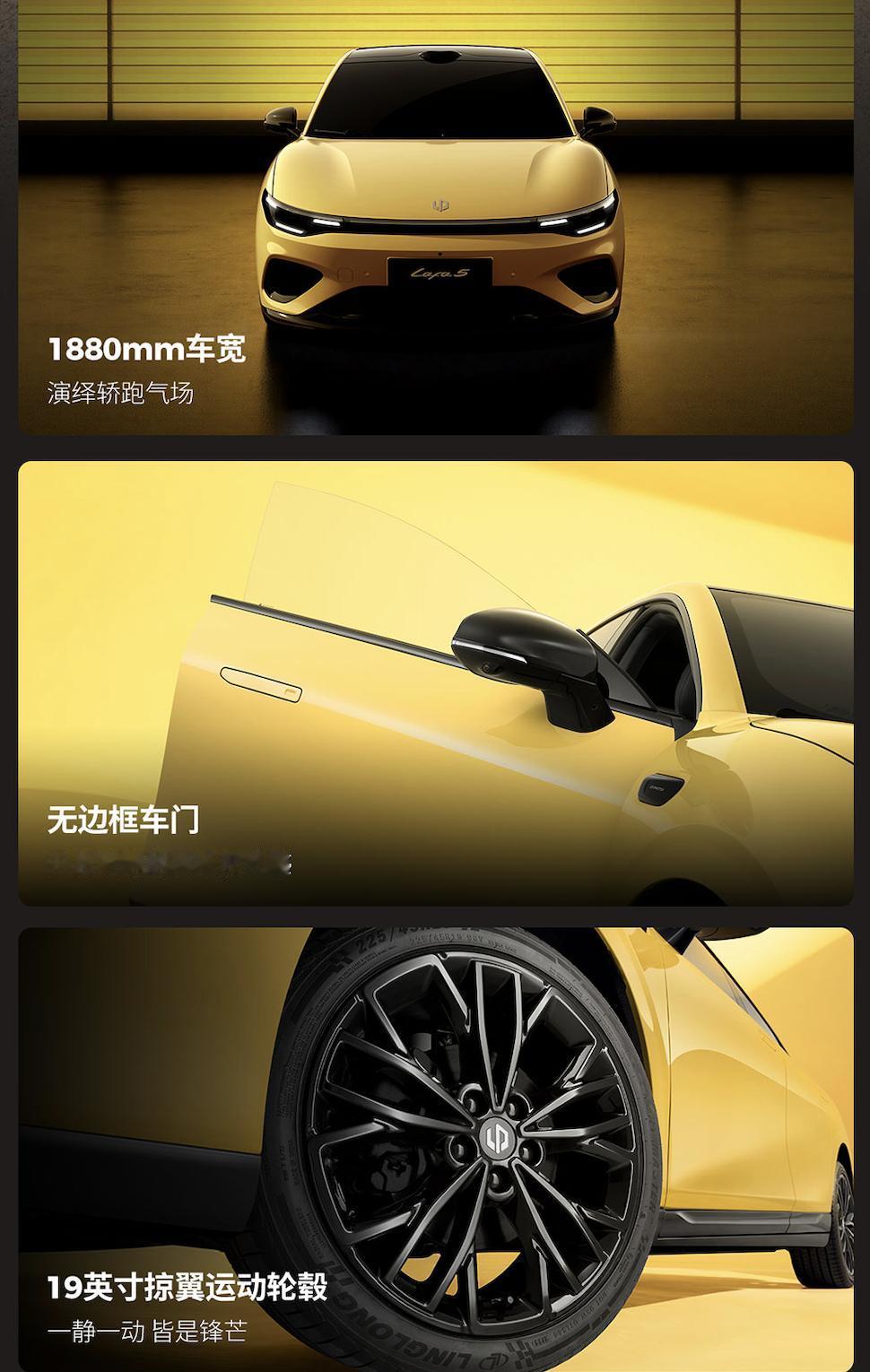零跑Lafa5正式上市,推出5款车型,限时优惠价9.28-11.68万元。 外观上,Lafa5采用“科技自然美学”设计理念,车身尺寸为4430/1880/1520mm,轴距2735mm,拥有同级最宽的1880mm车宽和0.256的超低风阻系数。其提供无框车门、纯平侧窗、一体式前灯和贯穿式尾灯,搭配19英寸抗震运动轮毂。颜色提供电掣黄、风驰灰、星夜蓝等多种选择、 内饰方面,Lafa5采用椭圆数字曲面中控设计,搭配256色氛围灯,超过80%的软质包覆面积,提供速域紫、驰影灰等多种内饰配色。座舱搭载高通8295芯片,配备14.6英寸2.5K悬浮中控屏和8.8英寸全液晶仪表,全系标配12扬声器音响系统。 动力与操控方面,Lafa5搭载160kW电机,采用后驱布局,由Stellantis欧洲团队进行运动化调校;电池容量最高可达67.1度,CLTC续航达到605km。【来自懂车帝车友圈】