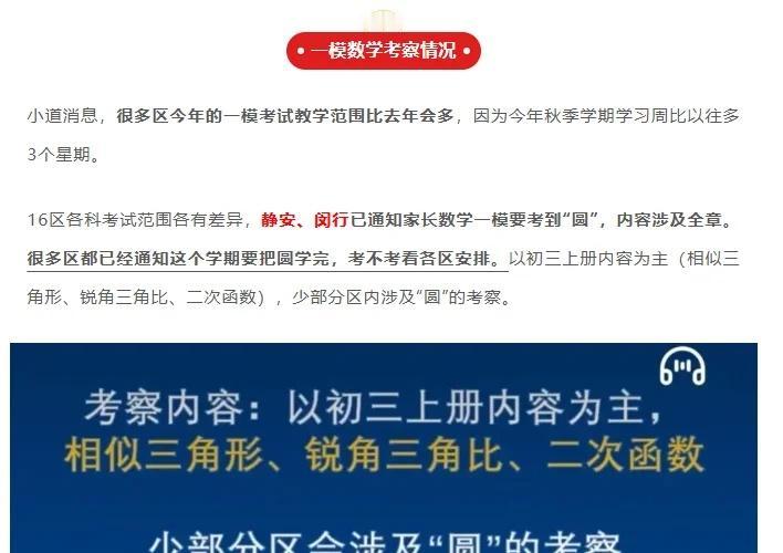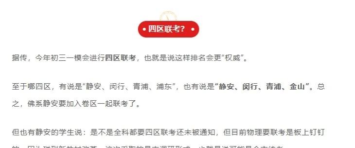 今年上海初三一模会不会很难?据说四区联考? 期中考试结束了,今年初三期中考各区都采用了新题型!难度也普遍比较大!据说今年一模会是近几年最难的![抓狂]另外也有传言说今年一模可能四区联考,具体消息看图~ 今年一模的一些信息,包括时间,考察范围,我也都放在图里了~ 关于一模的重要性,相信很多家长都有所了解。 一方面,它被视为TOP高中的“自招入场券”。每年一模考试结束后,不少高中会向各区表现优异的学生发出开放日邀请。对于志在冲刺牛校的考生而言,一模成绩无疑是一道关键门槛。 另一方面,一模也被视作中考的“风向标”,其题型设置与难度水平往往与中考高度契合。通过一模,考生能够迅速定位自己在全区中的位置,从而为后续的志愿填报把握大致方向。 尤其是随着近年来的中考改革,出题角度愈发灵活,主打一个跨学科交叉知识,更考察学生的综合能力。 老师给大家整理了去年一模真题,这段时间就要刷起来了,还有数学探究性新题型练习和物理化学重点考察知识!一模非常重要,大家现在就要准备起来了!上海初中 上海家长 上海中考 一模 上海初三 上海一模 上海一模数学 上海初中生 重点 上海一模考 上海初三一模上海中考一模 上海初三上海高中自招 上海中考 上海初三生 上海一模 上海初中一模