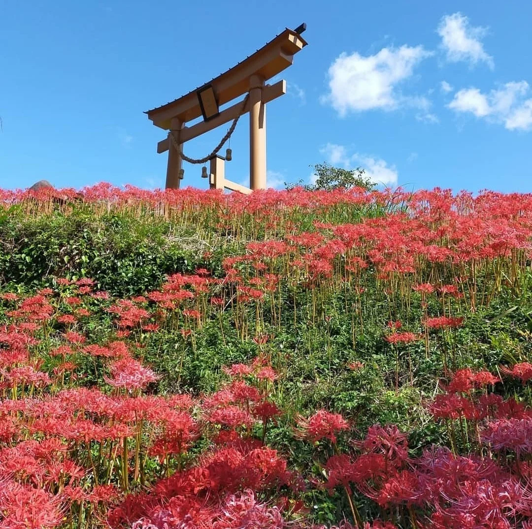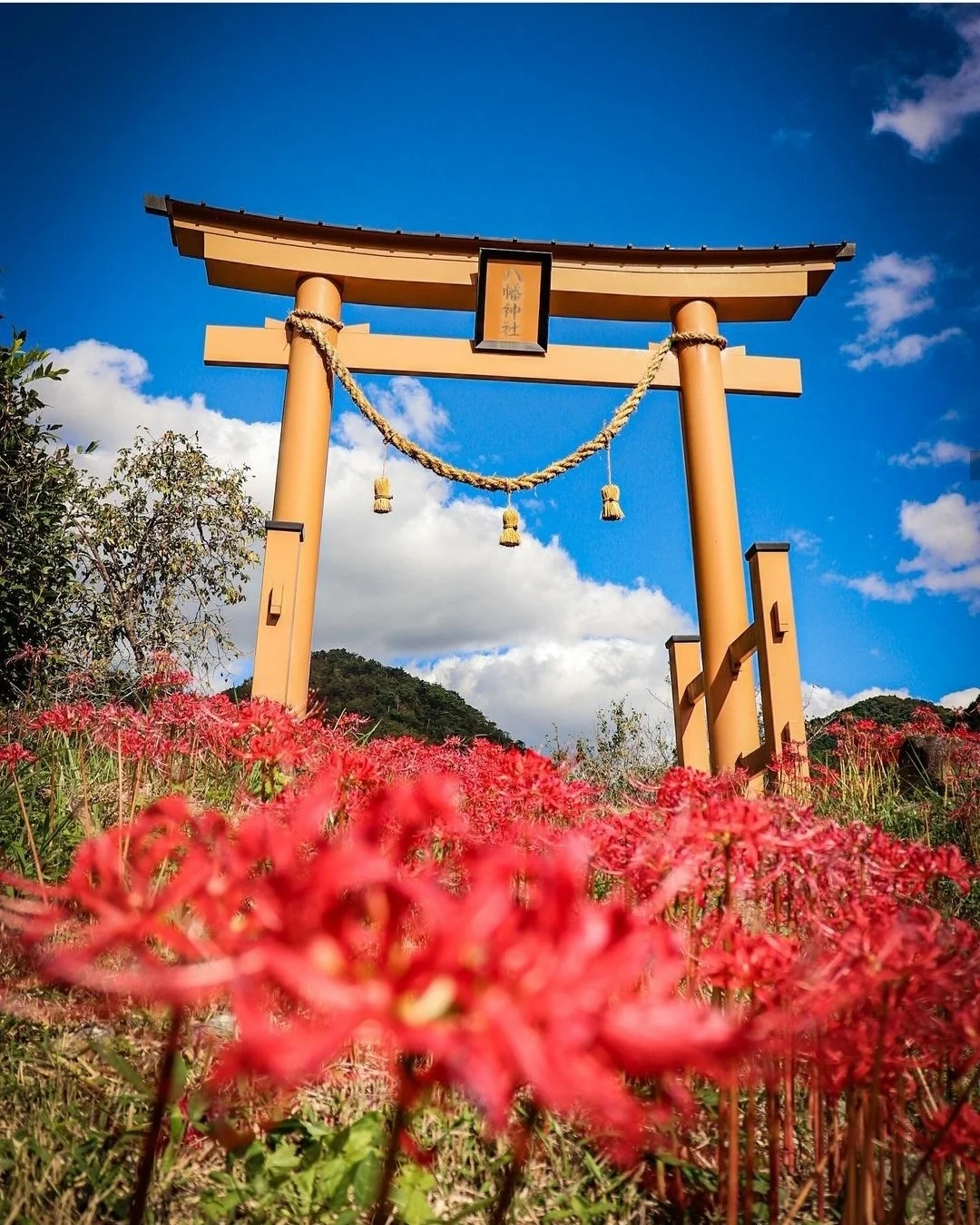 🌈就很美啊。不知道这么简单粗暴的说会不会有人想打我[捂脸R],可是大家看图嘛,这是什么神仙美景。很有层次感。远处高处的绿树,中间的黄色鸟居,近处的红的发火的彼岸花,配色绝了,自带滤镜。