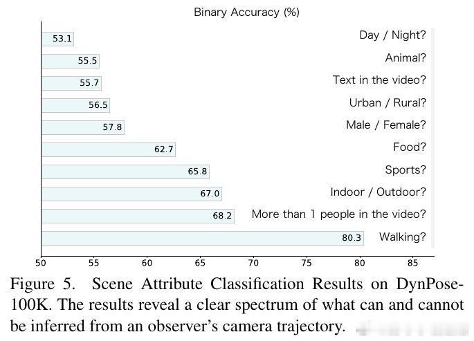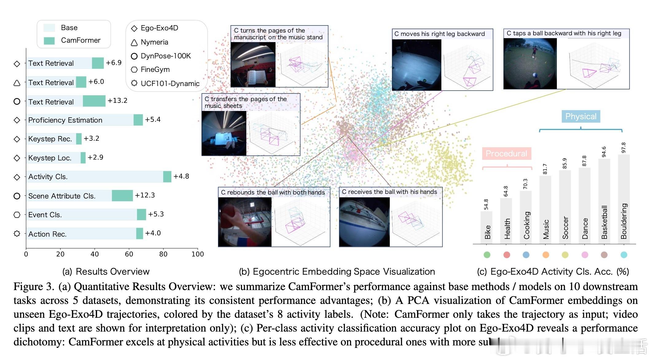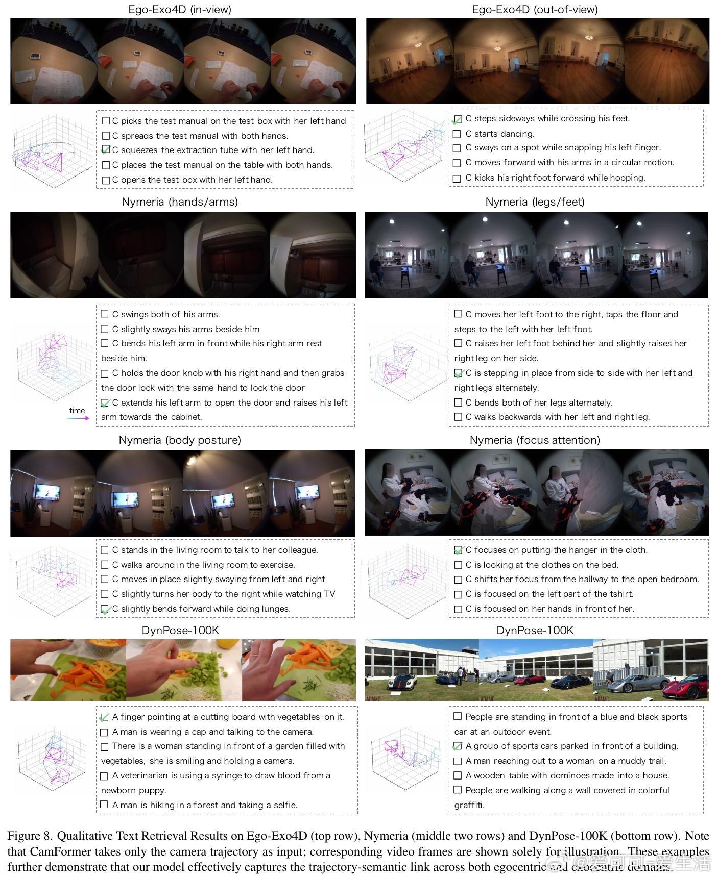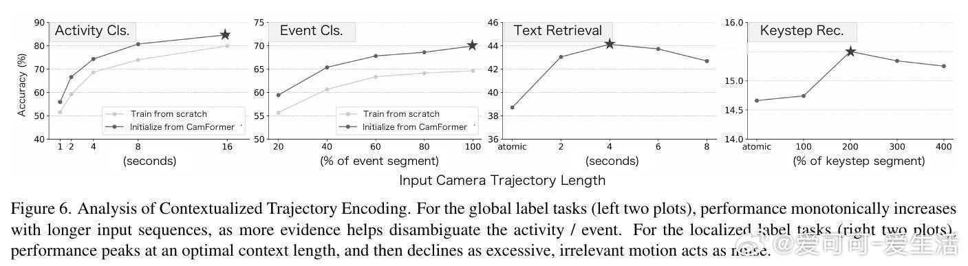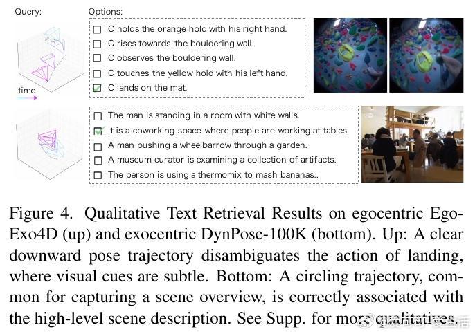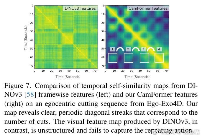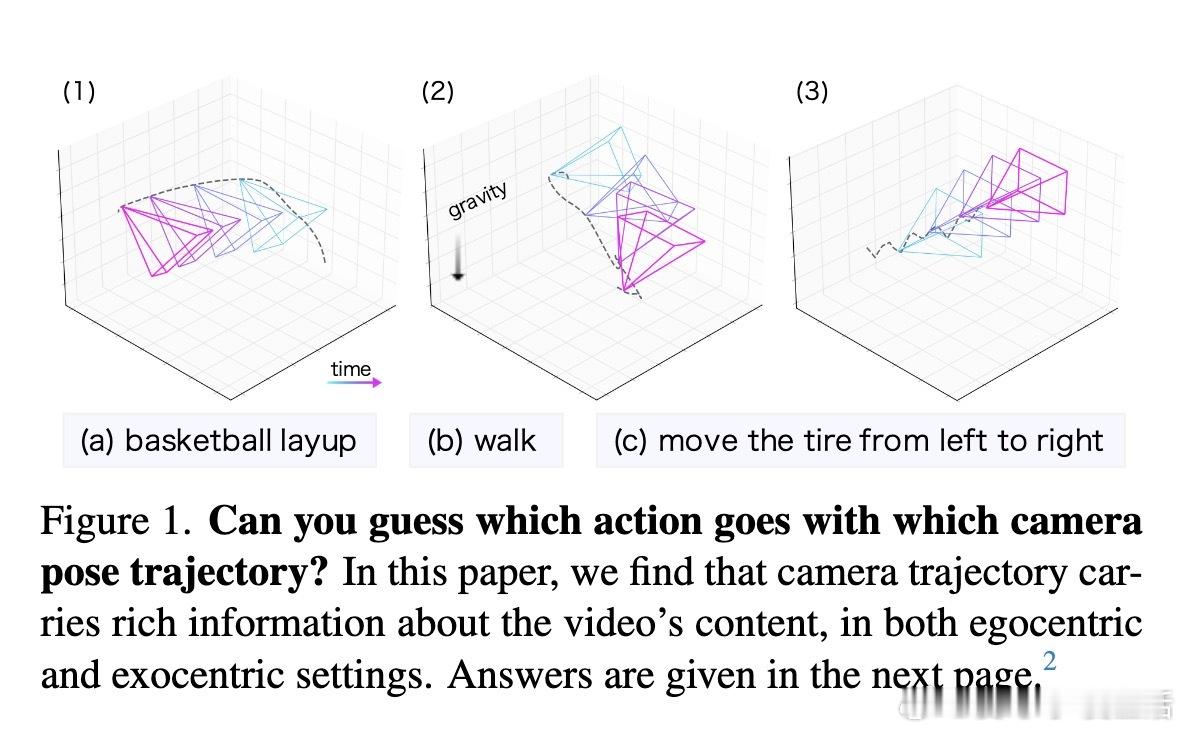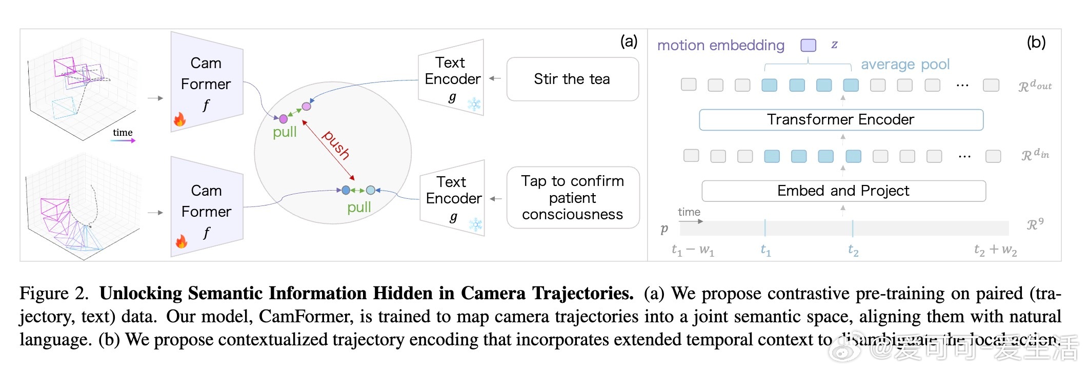 [CV]《Seeing without Pixels: Perception from Camera Trajectories》Z Xue, K Grauman, D Damen, A Zisserman... [Google DeepMind & The University of Texas at Austin] (2025) 有人能相信吗?仅凭摄像机的运动轨迹——没有看到任何像素内容——就能感知视频内容?本文开创性地提出了CamFormer,一种专门编码摄像机轨迹并与自然语言对齐的对比学习模型。事实证明,“你如何移动”,实际上能揭示“你在做什么”或“你在观察什么”。传统视频理解依赖视觉信息,但摄像机轨迹作为一种轻量、隐私友好的信号,从未被深挖其语义价值。CamFormer通过对摄像机的9维相对姿态序列进行Transformer编码,结合扩展的时间上下文,有效消解动作歧义,形成了强大的语义嵌入。在十项跨模式对齐、分类和时间分析任务中,CamFormer在自我视角(egocentric)和第三视角(exocentric)视频均表现出色,单独使用时甚至超越了计算量巨大的视觉模型。特别是在身体运动明显的活动(如篮球、攀岩)中,轨迹信号表现卓越;在程序性动作(如做饭、修车)中,轨迹与视觉互补,融合后效果最佳。更令人振奋的是,CamFormer对多种摄像机姿态估计方法均展现出强鲁棒性,从高精度多传感器SLAM数据到单目视频估计均适用,极大提升其实用价值。此外,它还能捕捉动作的周期性特征,实现重复动作计数,展现出对时间结构的敏锐感知。这项工作不仅开辟了视频理解的新范式,也呼吁社区重新审视摄像机轨迹的潜力。未来,随着姿态估计技术的进步和大规模轨迹数据积累,CamFormer有望在动作识别、技能评估、场景理解等领域发挥更大作用。更多细节、实验和可视化解析请见论文:arxiv.org/abs/2511.21681 项目主页:sites.google.com/view/seeing-without-pixels“眼睛不只是用来看,而是用来‘移动’的。”——摄像机轨迹,正是视觉意图的无声语言。