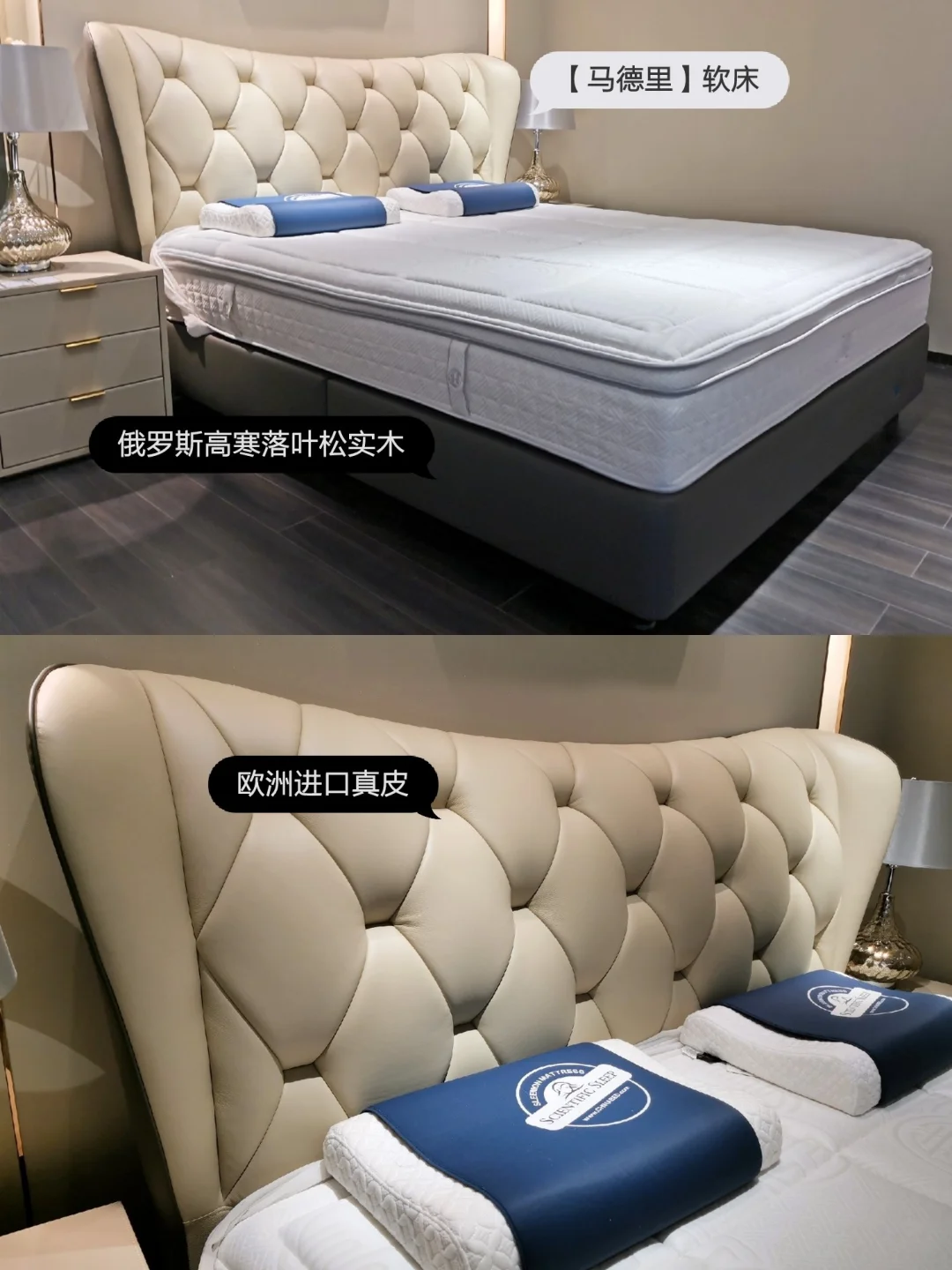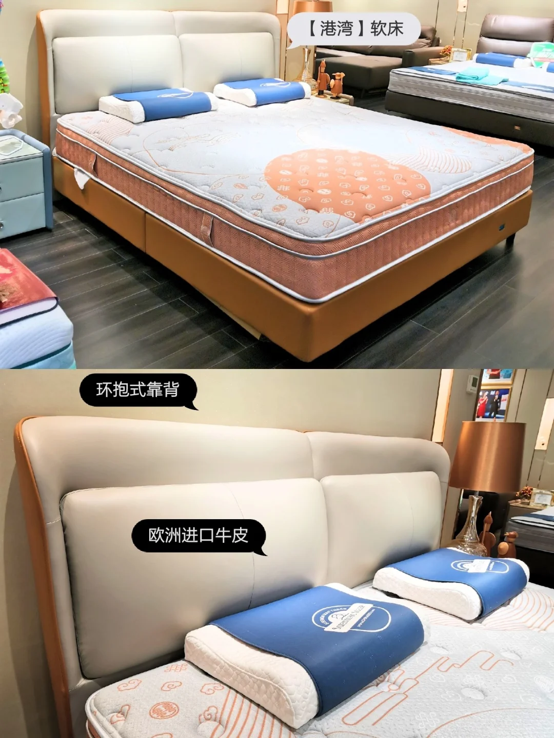 除了床垫,闺蜜还看中了😘【港湾】和【马德里】这两款床,都是用的欧式进口牛皮,床靠背柔软舒服、智能护脊,比较简约大气和百搭。