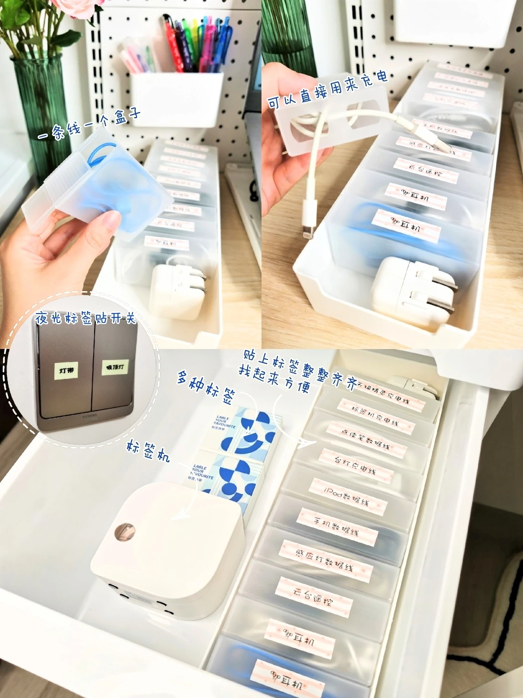 🔹入了一个数据线收纳盒,贴上标签,码得整整齐齐,找起来方便。